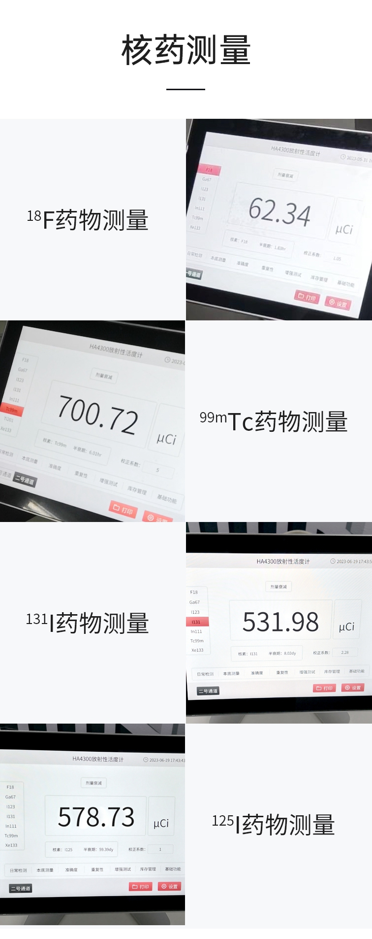 ④???? 覆盖常用核素:可测量核医学常用治疗核素如153Sm、90Y、131I、32P 等,可测量核医学诊断常用正电子药物如18 F、11C、15O、13N、68Ga 等;