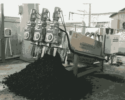 污泥在浓缩部经过重力浓缩后,被运输到脱水部,在前进的过程中随着滤缝及螺距的逐渐变小,以及背压板的阻挡作用下,产生极大的内压,容积不断缩小,达到充分脱水的目的。