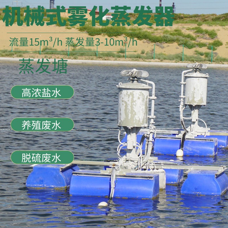机械雾化蒸发器特 点;产品于各应用领域运用成熟,在国内外有10年以上多项成功应用案例;设计考虑完善,产品适用性强,可应用于高浓度含盐量浓水处理;比较其他蒸发处理方式投资成本较低,后续维护及保养压力轻松;产品设计先进,材质可靠,使用中无其他类似设备普遍存在的结垢问题,耐腐蚀性强;无需辅助加热,运行费用极低;安装、操作、维护简单;全自动控制,可实现多台数集中控制;机械雾化蒸发技术优势;广泛意义上的零排放处理技术;运行管理灵活机动、可靠性高;水分蒸发对周围生态环境影响小;蒸发效率高,是自然蒸发效率的5~20倍;蒸发塘单元化,易于完成盐分等颗粒物的收集与处理;可适于常/低温蒸发,设备简单,易于安装、运行、管理;可显著减小蒸发塘占地面积,节约大笔资金投入。合理配置蒸发器所使用水面积是依赖自然蒸发塘面积的10~30%;投资少见效快。不需加热蒸发,吨水耗电4~5KWh,运行成本极低;为高效、节能、环保、可靠、经济的高盐水处理解决方案。机械雾化蒸发技术,机械雾化蒸发技术是一种通过工业化的专业机械雾化蒸发器
