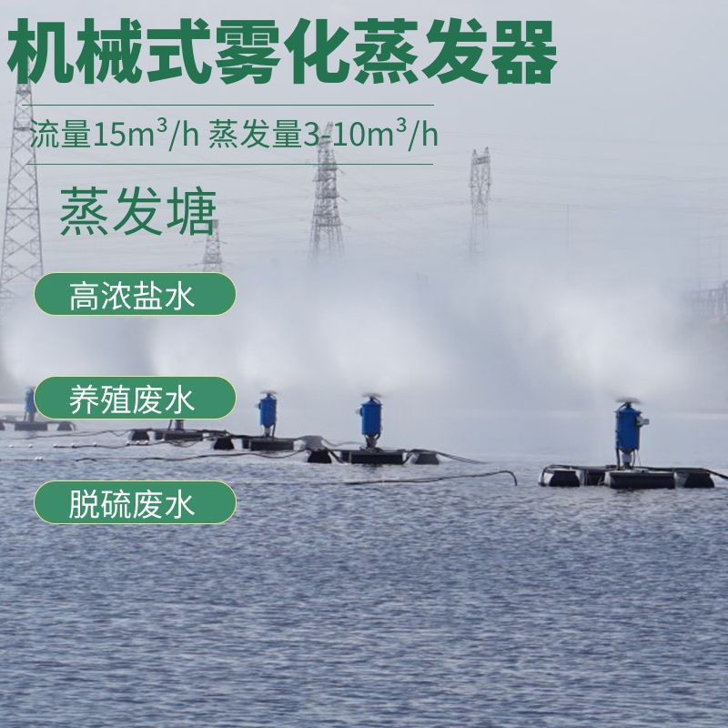 机械雾化蒸发技术优势;广泛意义上的零排放处理技术;运行管理灵活机动、可靠性高;水分蒸发对周围生态环境影响小;蒸发效率高,是自然蒸发效率的5~20倍;蒸发塘单元化,易于完成盐分等颗粒物的收集与处理;可适于常/低温蒸发,设备简单,易于安装、运行、管理;可显著减小蒸发塘占地面积,节约大笔资金投入。合理配置蒸发器所使用水面积是依赖自然蒸发塘面积的10~30%;投资少见效快。不需加热蒸发,吨水耗电4~5KWh,运行成本极低;为高效、节能、环保、可靠、经济的高盐水处理解决方案。机械雾化蒸发技术,机械雾化蒸发技术是一种通过工业化的专业机械雾化蒸发器(Enhanced Evaporator)利用蒸发塘将各种水雾化喷入大气,增加雾化水滴在大气中的比表面积和“悬浮时间”加速水的蒸发效果的技术。机械雾化蒸发器采用国内先进特有喷嘴,将水流雾化成极小的水滴,水滴直径可达100μm以下,大大增加水滴与空气接触的比表面积,加速水分蒸发大大减小蒸发塘占地;同时,喷嘴雾化独特工艺设计保证盐分、游滴等颗粒及大分子**物的集聚回落至蒸发塘饱和收集单元,便于结晶盐等固体颗粒的收集与采掘。机械雾化蒸发技术是一种“增强型“的自然、生态与环保蒸发技术,对周围环境无影响且能提高周围的水环境生态。同时,大规模进行的机械雾化蒸发甚至能间接局部改变当地的气候环境。