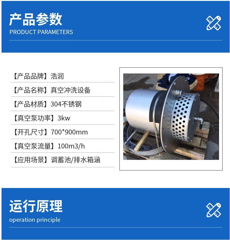 调蓄池真空冲洗设备是一种高效的清洗装置,可以有效地清除调蓄池中的污垢和沉积物。其工作原理是通过将存水室内的空气抽出形成真空度,使液位升高至设定高度,然后通过隔膜阀打开将储水释放,底部喷射出的水形成强力的射流,将池底的沉积物卷起冲刷干净。