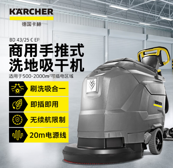 卡赫洗地机BD 43/25 C Bp,自走式电池驱动盘刷洗地机,具有机身紧凑、行动方便、工作噪音低并且易于操作等优点。工作宽度达到43 cm 并配有一个25升水箱。本机非常适合清洁狭小的区域或脏乱的工况。使用者在使用时可以保有较好的视野。BD 43/25 C 的 EASY易操作系统和黄色部件标示设计方便使用和维修。我们推荐在每使用达到900平方米的清洁任务完成后,对本机进行简单的维护保养。