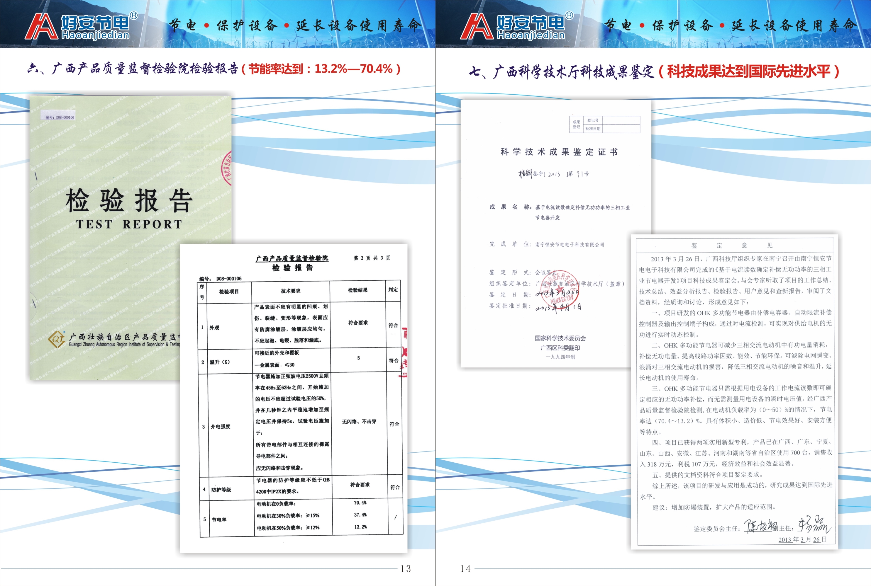 20133月经广西壮族自治区质量监督检验院检验,产品节电率可达13.2%—70.4%(成果登记号201392880),评价委员会一致认为该项目技术达到国际先进水平。