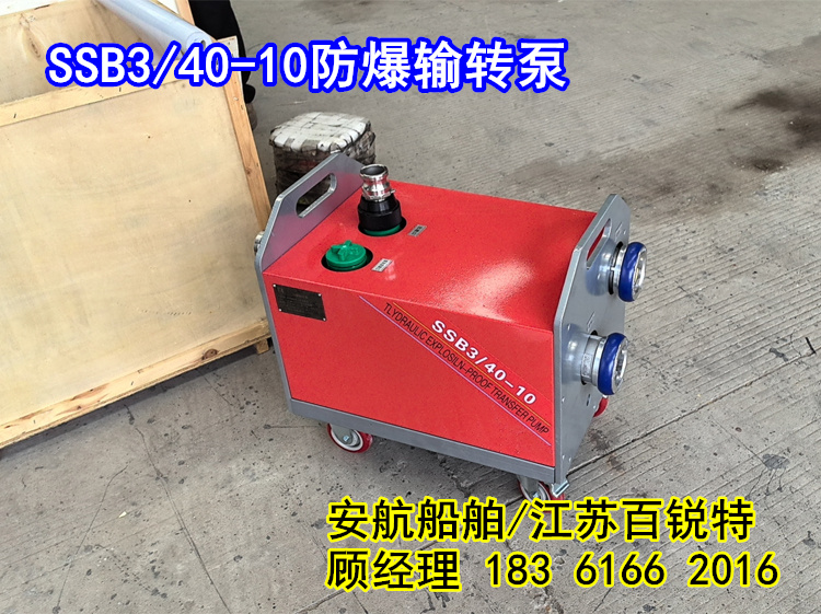 SSB3/40-10水力防爆输转泵动力源为消防高压水源,安全防爆。外壳PUR涂层保护,内带驱动装置。高压水流注入泵体内,带动水轮机工作形成负压,从而抽吸各种易燃易爆液体(特别是易燃易爆液体,如:燃油、机油、废水、泥浆、易燃化工危险液体、放射性废料等),排液量6-22吨/小时,负压真空压力1.5巴,吸入颗粒5毫米。流量范围4-22M3h;工作压力≤2巴;操作温度≤80摄氏度;长工作时间≤5小时.