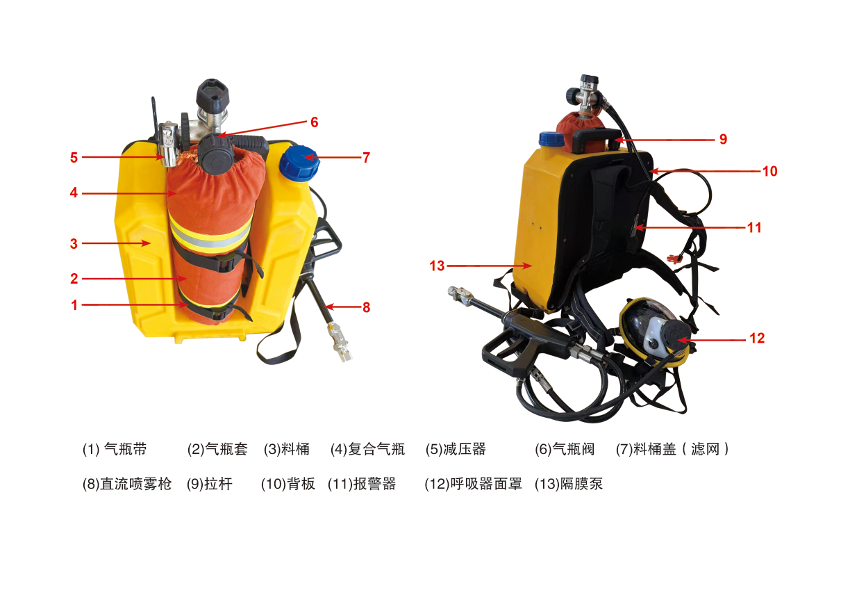 技术性能符合XF 124-2013《正压式空气呼吸器》和GB/T16556-2007《正压式空气呼吸器》标准要求。