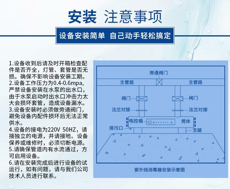 紫外线杀菌器的杀菌原理是利用紫外线光子的能量破环水体中各种病毒、细菌以及其它致病体的DNA结构。主要是使DNA中的各种结构键断裂或发生光化学聚合反应,例如使DNA中THYMINE二聚,从而使各种病毒、细菌以及其它致病体丧失复制繁殖能力,达到灭菌的效果。具有高效率、广谱性、低成本、长寿命、大水量和无二次污染的特点。