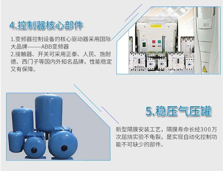 二次供水无负压设备可配备无负压供水专用变频器,并运用模糊控制理论使系统运行更加合理。另外二次供水设备装有“自动” “手动”转换开关供用户选择;延长了水泵及电机的使用寿命,无水锤现象,电机变频软启动;延长了管道使用寿命,在不用水时或用水量较小的情况下,减少了管网压力,使得管网不易破裂,极大地节约了管道的维修费用;取消了高位水塔或水箱、气压罐。一方面解决了水的二次污染问题,另一方面节省了建设它们的工程建设费;节电一般可达30%左右。因为居民用水量是随时间变化的,而远科二次供水设备可根据用水量的变化,自动改变水泵转速或增减水泵工作台数达到恒压供水,达到节电目的;自动化控制,克服了人工控制可能带来的误操纵,同时大大操纵工人的劳动强度和人数,并可实现远程操纵和远程监控;功能齐全。二次供水设备有多种保护功能:过载、过热、过压、欠压、过流、缺相等。各种工作状态都有指示灯显示。
