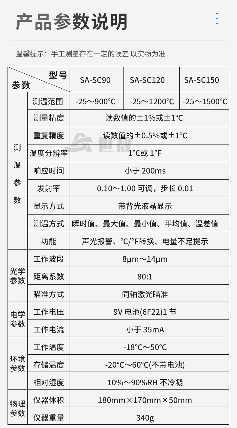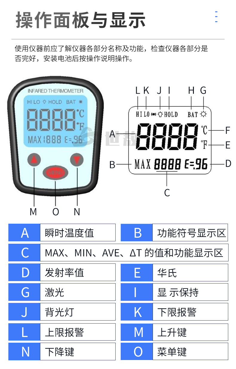 功能 | 声光报警、℃/°F转换、电量不足提示 | ||
