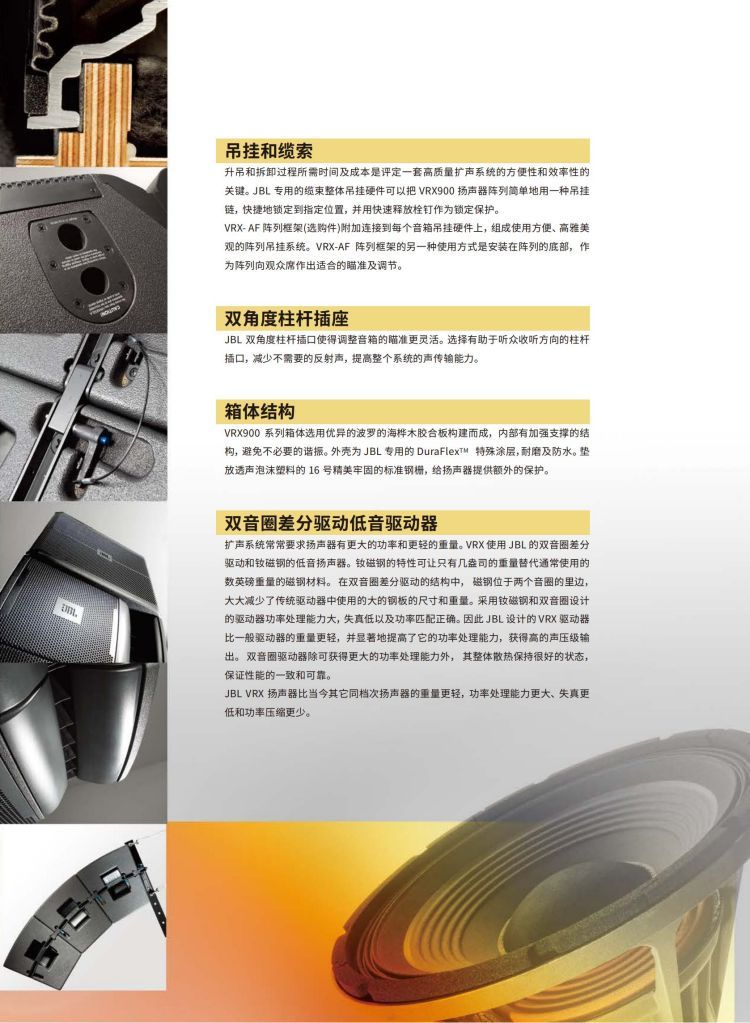 VRX900 系列扬声器采用了 JBL 著名的 VERTEC 系列远投射高性能大型线阵列扬声器的设计技术和优秀组件,并按照世界流动演出工业标准生产。非常完美地适合各类中小型厅堂地扩声应用。VRX 比 VERTEC 线阵列扬声器设计得更为紧凑和便于携带,拥有惊人的功率传送能力,清晰的声音和灵活的安装方式。