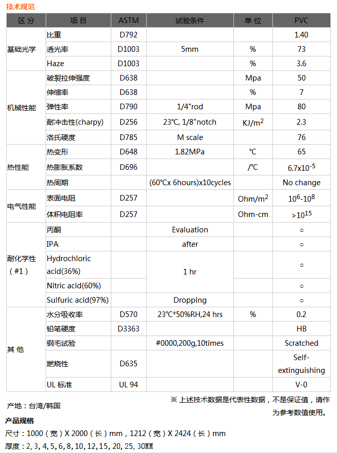 防静电PVC板也称为防静电聚氯乙烯板,基材为 PVC (聚氯乙烯)。通过镀膜技术,在完美地保留 PVC 耐腐蚀、阻燃等性能的基础上,使其同时具有优秀的防静电功能。表面硬度高抗刮伤性优良;表面电阻值为10的6~10的8次方欧姆,具有优秀的防静电功能, 抗冲击及耐化学溶剂性能突出;外观靓丽,非常平整光滑;透光率达73%以上。阻燃等级为ul-94: v-0。