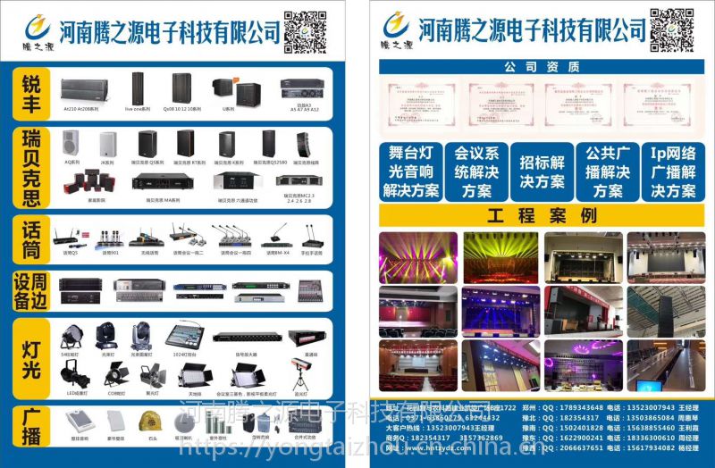 河南腾之源电子科技有限公司是一家专业从事舞台灯光音响、会议室音视频系统、数字会议系统、无纸化会议系统、会议控制系统、智能公共广播(背景音乐)、ip网络广播设计、安装于一体专业化公司。旗下设有大客户部、专业音响会议系统事业部、公共广播事业部、舞台灯光事业部、视频集成事业部,我公司以良好的商业信誉、专业的施工技术和科学完善的管理模式,赢得了客户的广泛赞誉。