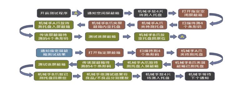 每台隔离箱里可以放4个DUT串行测试,八台箱子分上下两半部分,独立运行;送料吸盘模组对应每台隔离箱单独动作,高效运作,节省时间,提高产能