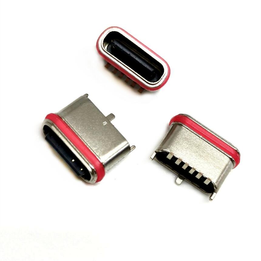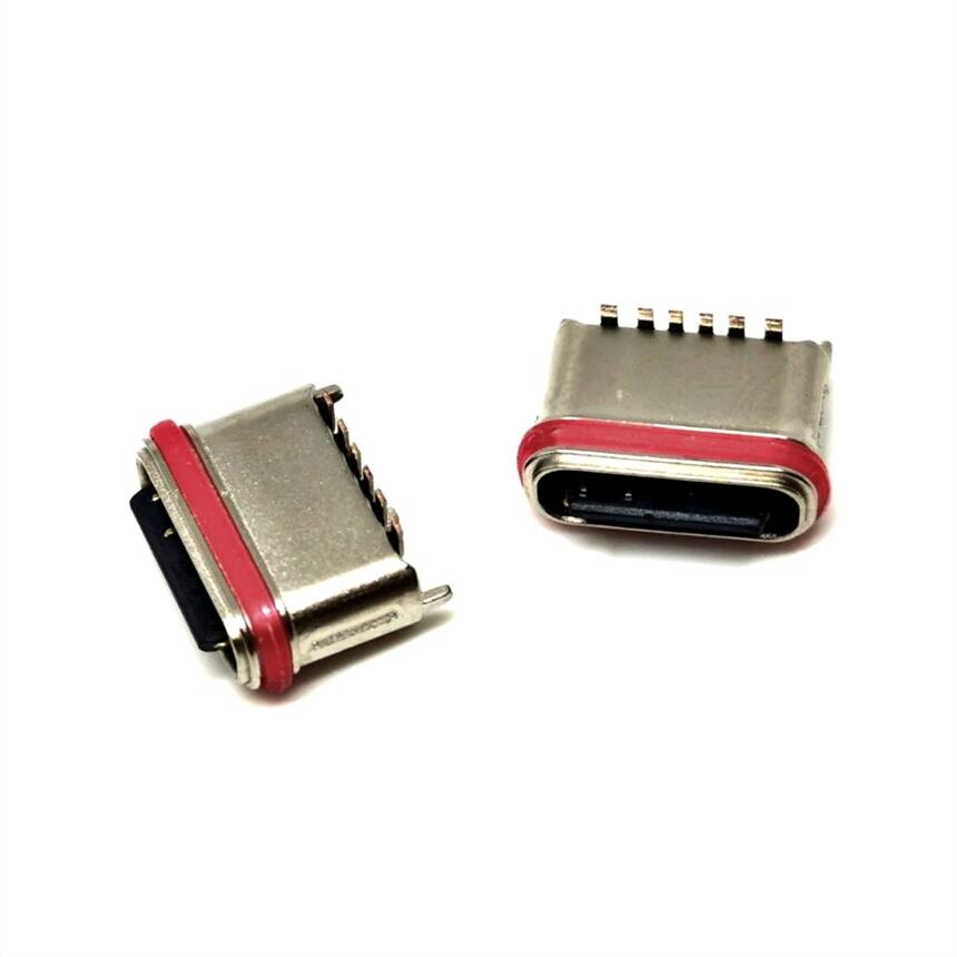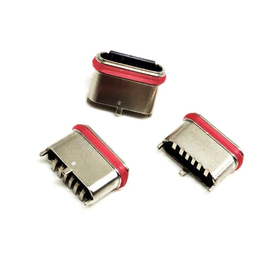 TYPE-C 6P直立式贴板防水插座 外壳三脚插板DIP 防水7级带胶圈