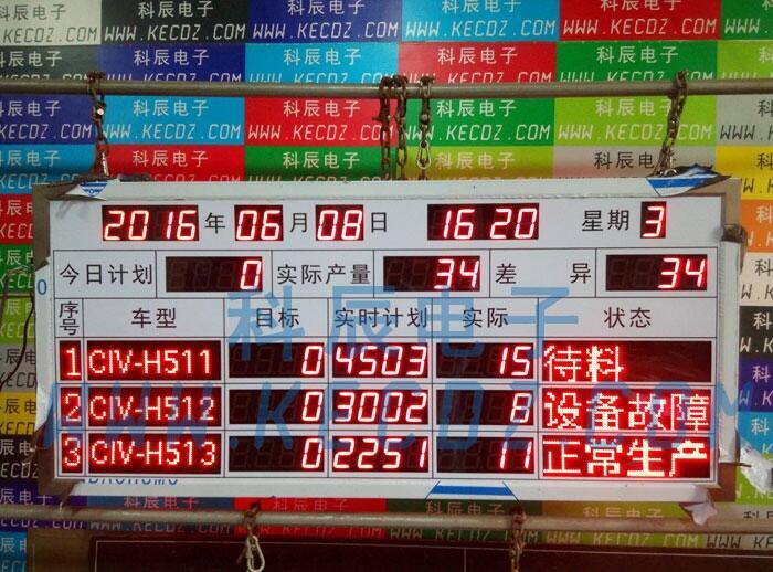12.其他功能:看板内置时段管理功能,可设置任意时刻暂停或启动,可设置自动清0或赋值(如每日生产8点前实际产量                    数自动清0,早中晚班计划数量自动切换,生产休息时间自动开始暂停等)最多可以设置30个时段;看板上所有数据( 除点阵上的文字)均可由现场遥控器修改。