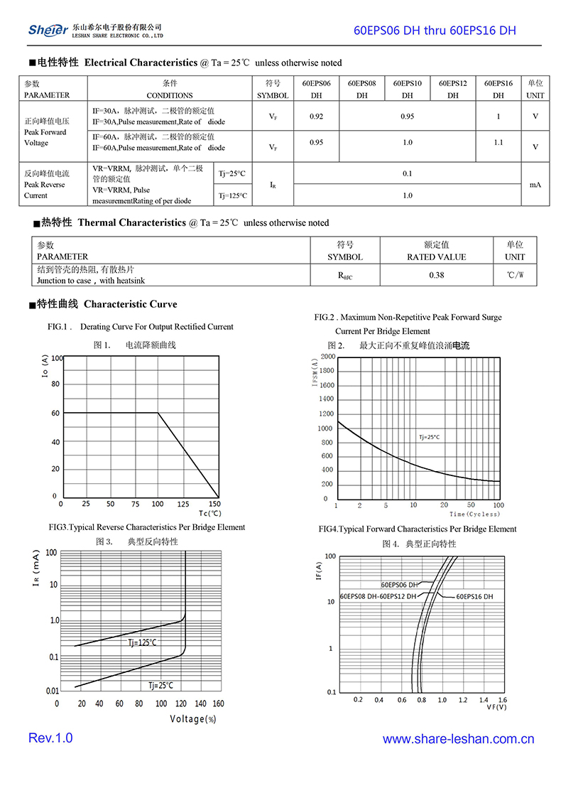 sheier/乐山希尔 全新原厂原装普通整流二极管:60EPS16 DH,60EPS14 DH;正向整流电流:60A;反向峰值电压:600V~1600V;封装方式:TO-247AC。通用电源、电器、适配器、充电器、充电桩、工控、医疗设备、工业特种电源、高频电源、风光储新能源、逆变器、伺服电机马达等产品电路作整流、续流、开关、钳位、防反接、防回流等作用。GPP大芯片高电压大电流大功率插件式通用常规标准二极管60EPS16DH/60EPS14DH。
