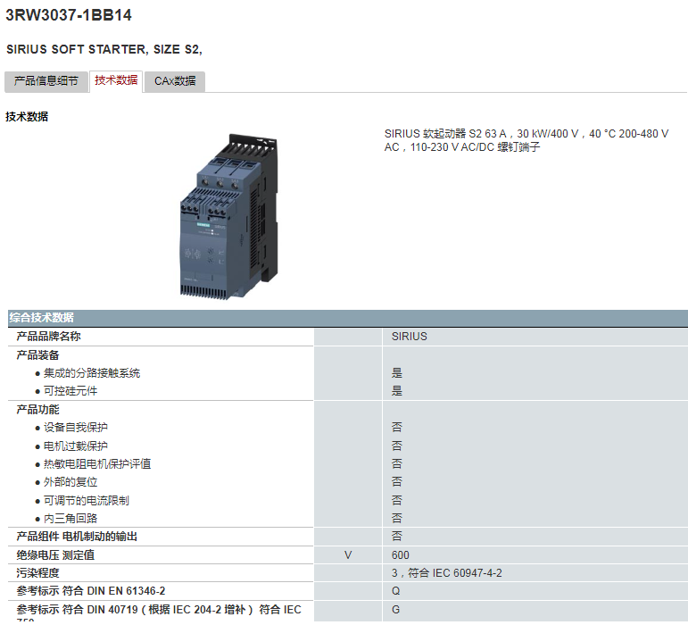 原装西门子3RW3037-1BB14 软起动器30KW/63A