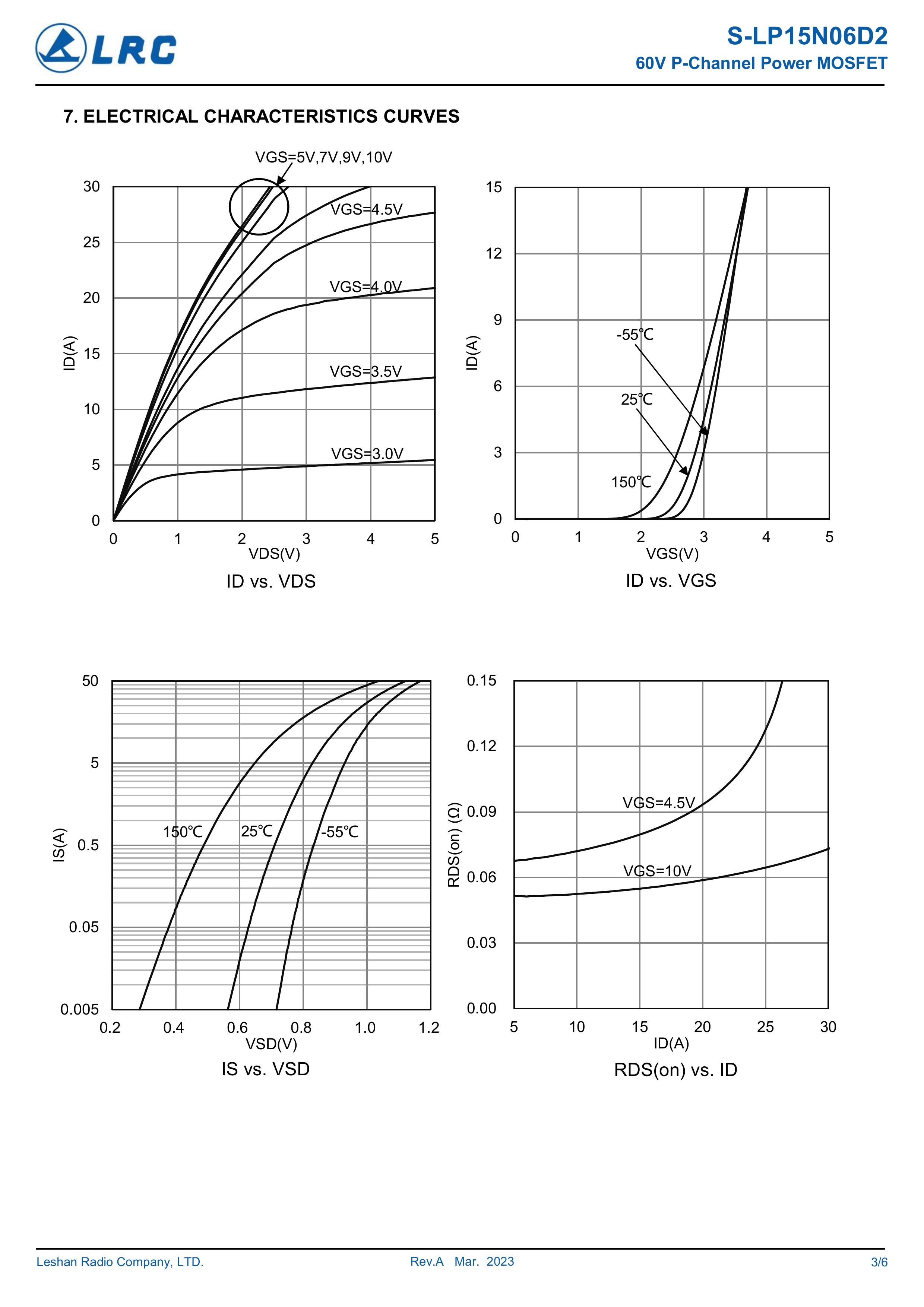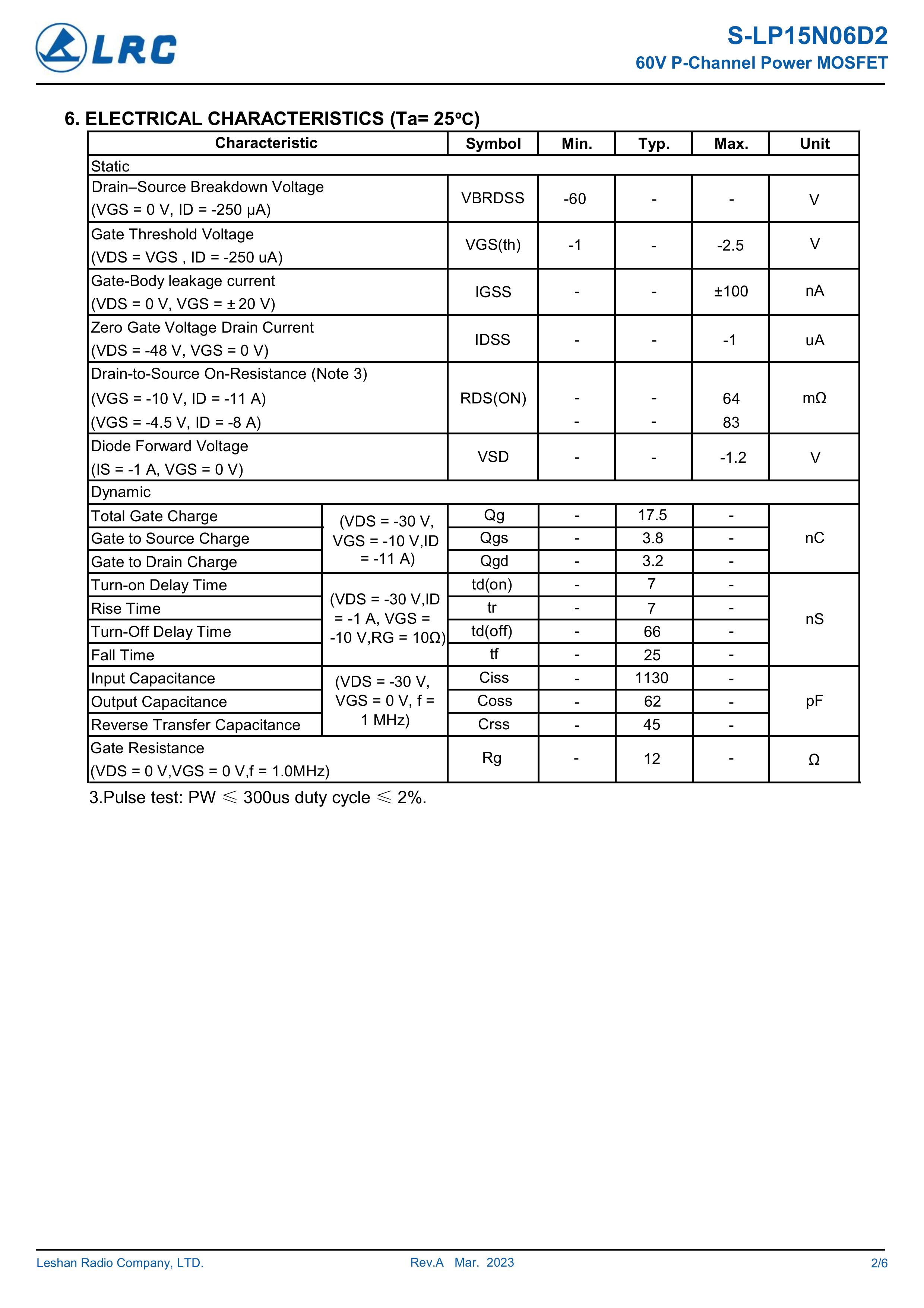 LRC/乐山无线电 S-LP15N06D2 全新原厂原装中低压高频功率控制电子开关管,车规级P型沟道场效应管-60V、-15A、64mΩ、P-Channel、贴片式中低压MOSFET:S-LP15N06D2/P15N06。Vds电压:-60V;Id电流:-15A;Rds(on)内阻:64mΩ;封装方式:TO-252-2L;最小包装数量:2500pcs/盘-编带。