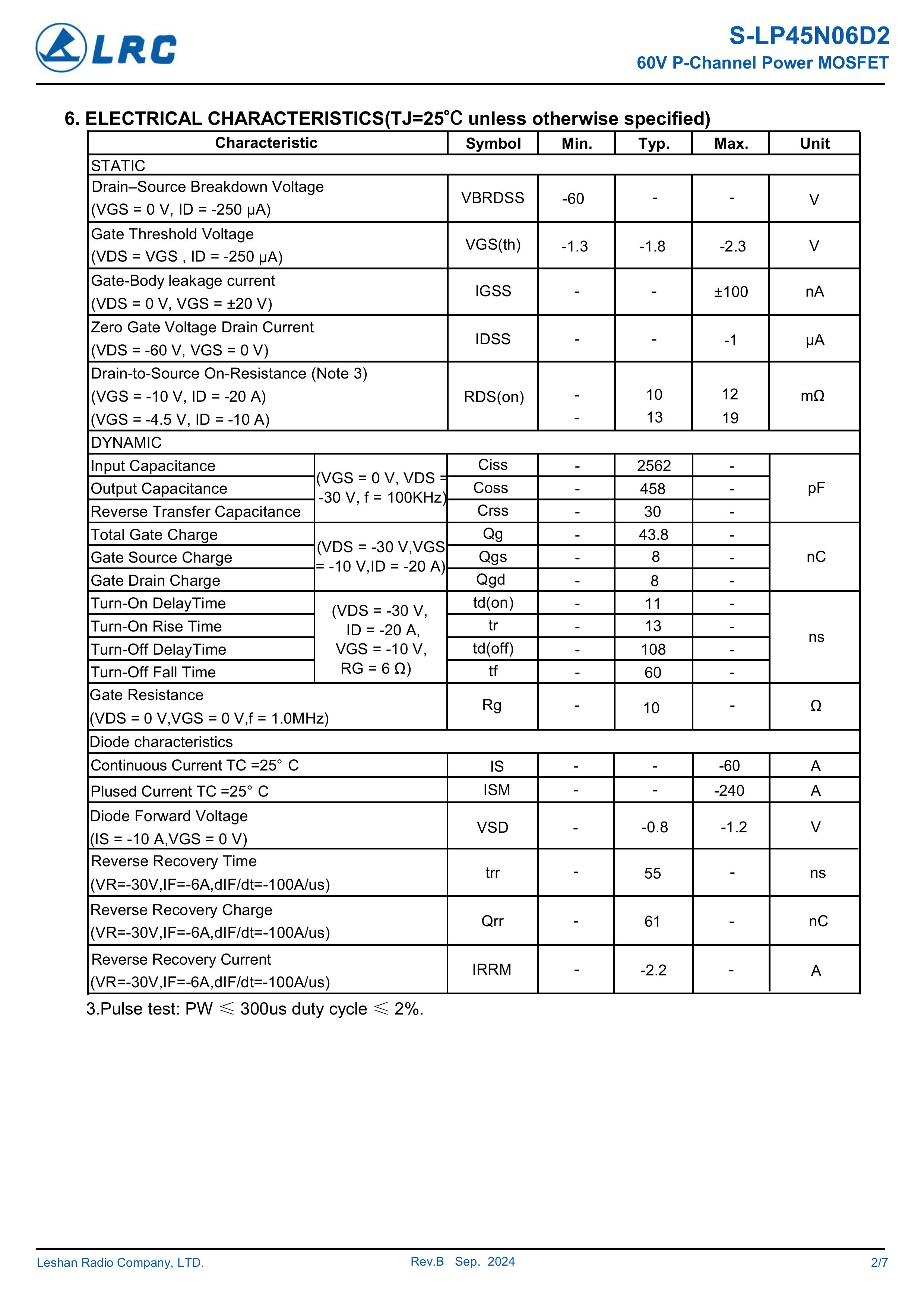 LRC/乐山无线电 S-LP45N06D2 全新原厂原装中低压高频功率控制电子开关管,车规级P型沟道场效应管-60V、-56A、10mΩ、P-Channel、贴片式中低压MOSFET:S-LP45N06D2/P45N06D2。Vds电压:-60V;Id电流:-56A;Rds(on)内阻:10mΩ;封装方式:TO-252-2L;最小包装数量:2500pcs/盘-编带。