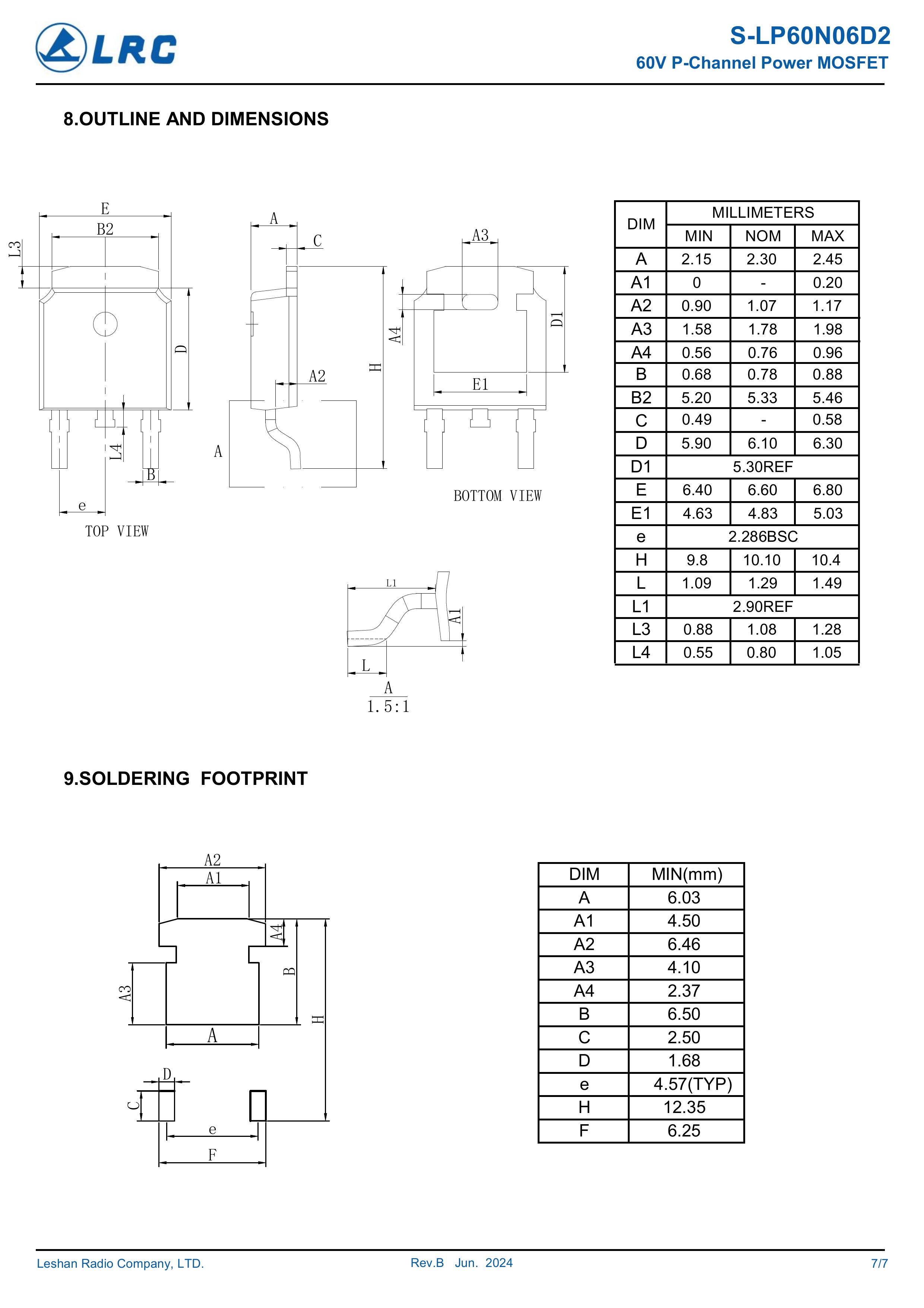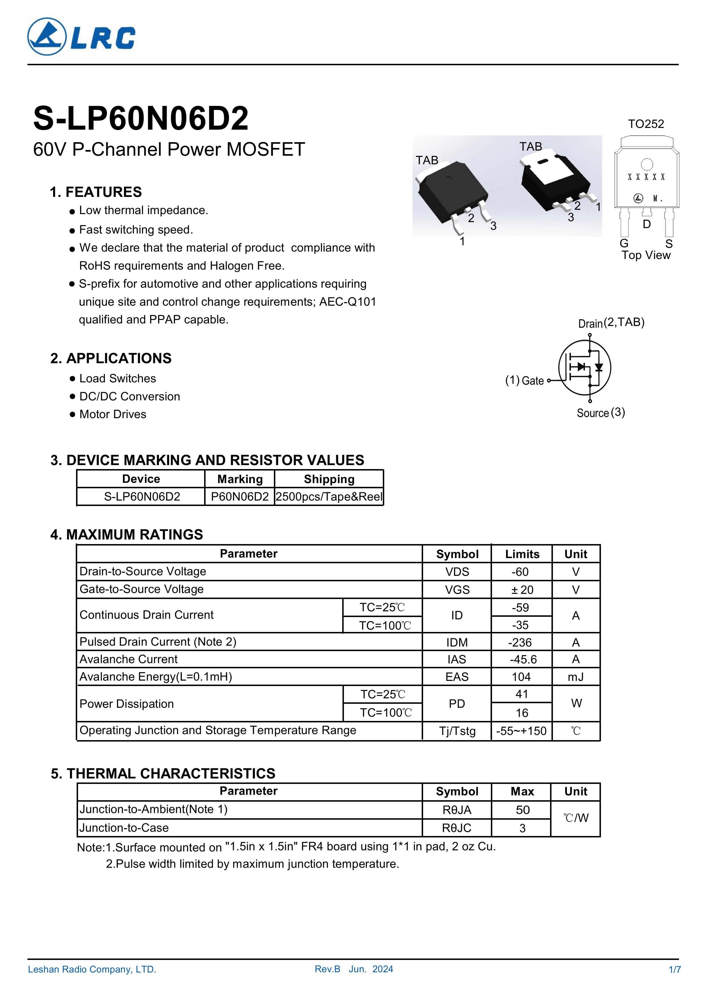 LRC/乐山无线电 S-LP60N06D2 全新原厂原装中低压高频功率控制电子开关管,车规级P型沟道场效应管-60V、-59A、9.8mΩ、P-Channel、贴片式中低压MOSFET:S-LP60N06D2/P60N06D2。Vds电压:-60V;Id电流:-59A;Rds(on)内阻:9.8mΩ;封装方式:TO-252-2L;最小包装数量:2500pcs/盘-编带。