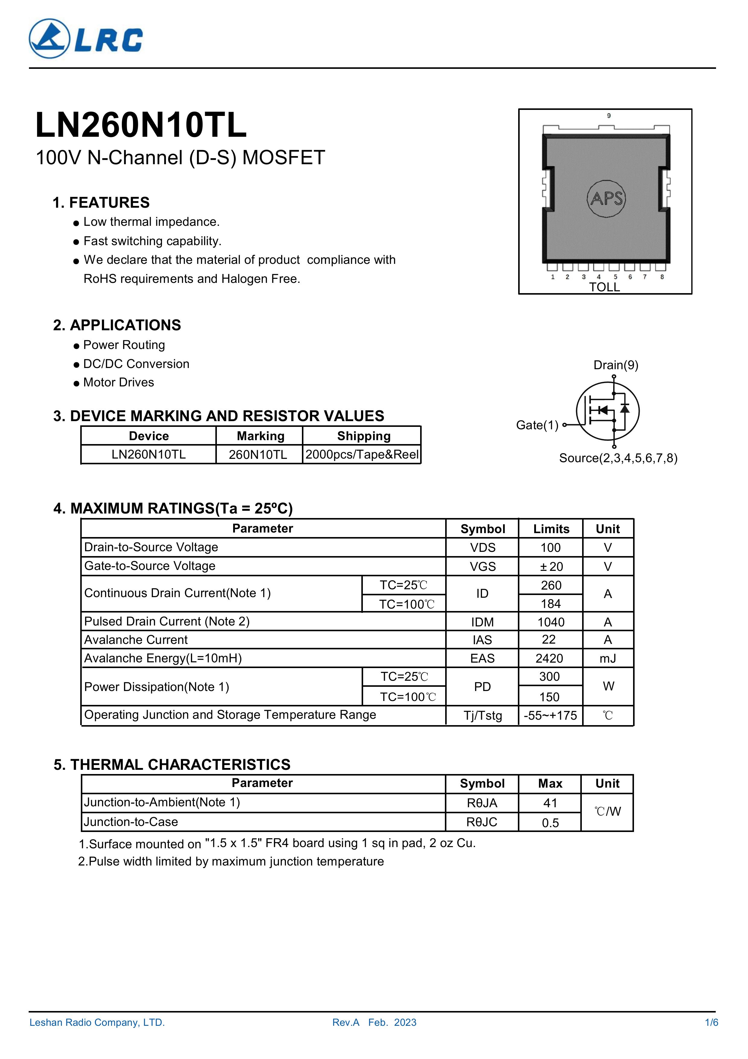 LN260N10TL/260N10TL 大芯片中低电压大电流低内阻低漏电的分立式功率整流晶体开关管。本品采用内置大尺寸芯片,源极7脚位支持多路输出贴片式封装,,具有适应中低电压低内阻损耗高频高效恢复快等电气特性特点。通用于电源、小家电、锂电池、马达电机、电动工具、无人机、电器、适配器、充电器、逆变器、充电桩、特种电源、高频电源、风光储新能源、医疗设备、工业工控等产品电路作电子开关、控制、整流、放大、钳位、防反接、防逆回流等作用。