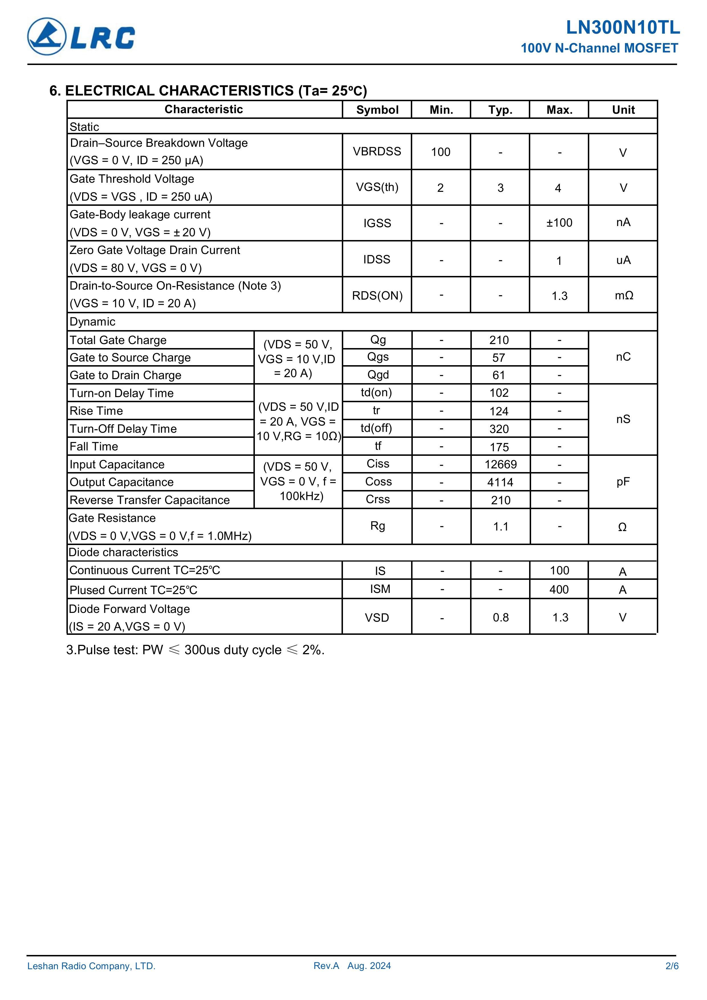 LN300N10TL/300N10TL 大芯片中低电压大电流低内阻低漏电的分立式功率整流晶体开关管。本品采用内置大尺寸芯片,源极7脚位支持多路输出贴片式封装,,具有适应中低电压低内阻损耗高频高效恢复快等电气特性特点。通用于电源、小家电、锂电池、马达电机、电动工具、无人机、电器、适配器、充电器、逆变器、充电桩、特种电源、高频电源、风光储新能源、医疗设备、工业工控等产品电路作电子开关、控制、整流、放大、钳位、防反接、防逆回流等作用。