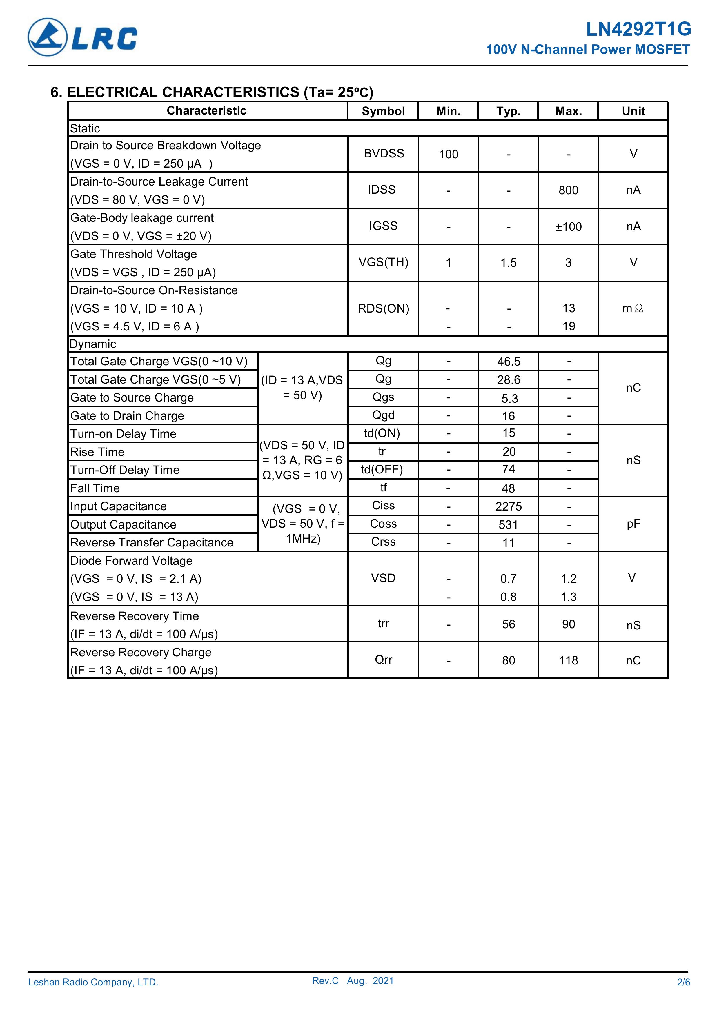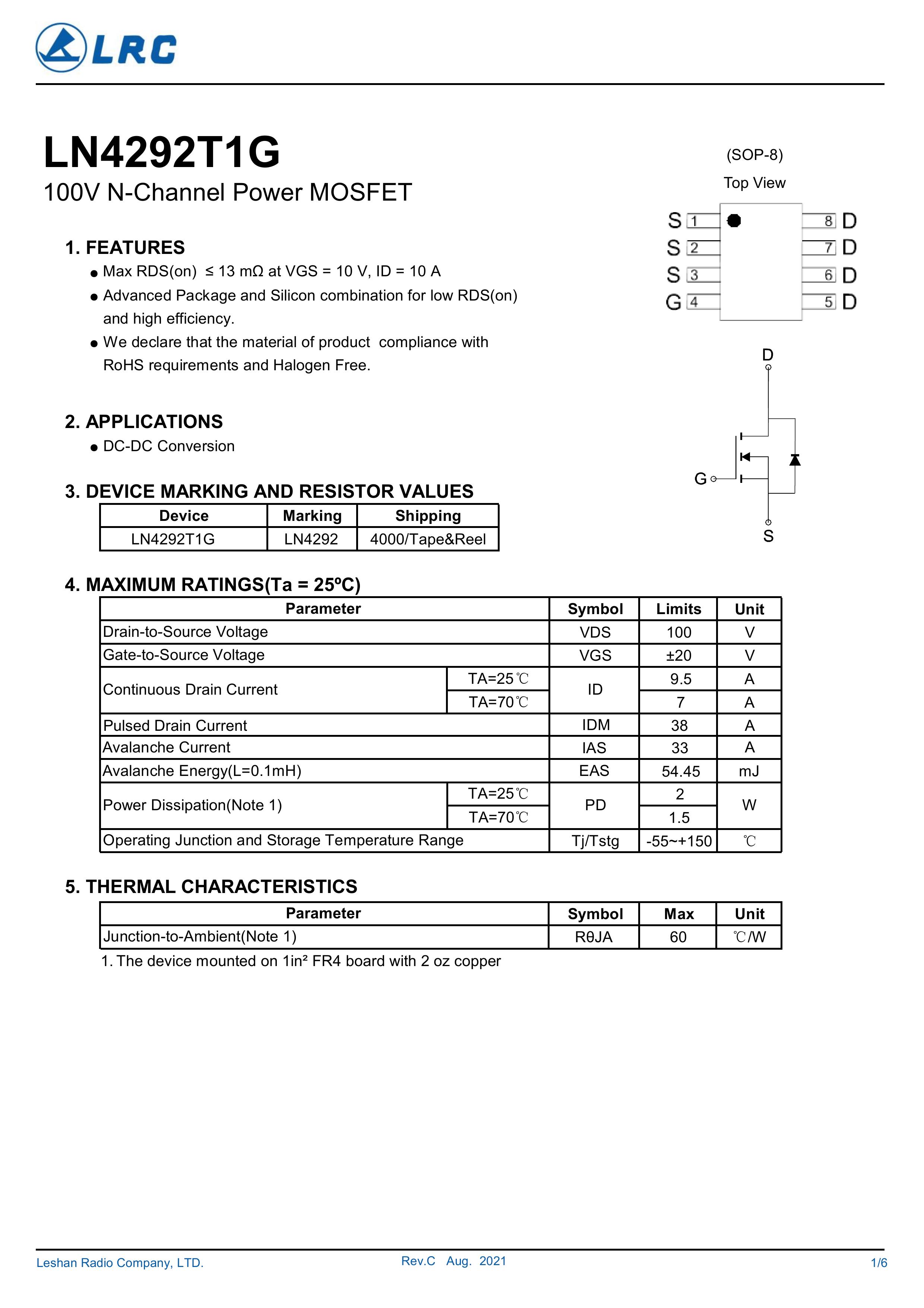 LRC/乐山无线电 LN4292T1G/LN4292 全新原厂原装中低压高频分立功率器件电子开关场效应管,多路源极漏极N型沟道场管100V、9.5A、13mΩ、N-Channel、贴片式中低压MOSFET:LN4292T1G/LN4292。Vds电压:100V;Id电流:9.5A;Rds(on)内阻:13mΩ;封装方式:SOP-8;最小包装数量:4000pcs/盘-编带。