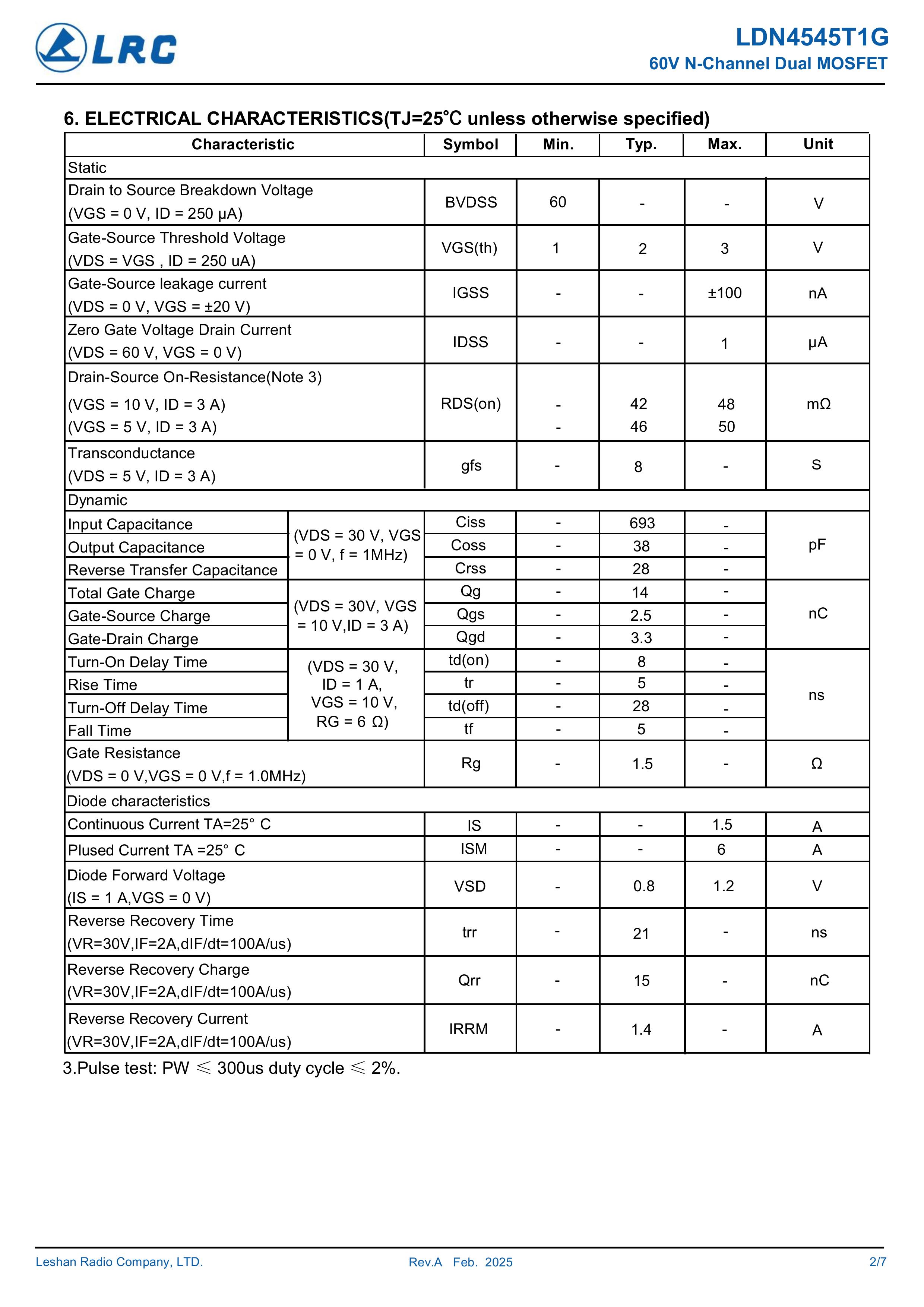 LRC/乐山无线电 LDN4545T1G/4545 全新原厂原装中低压高频分立功率器件电子开关场效应管,两路漏极N型沟道场双管60V、4.5A、42mΩ、N-Channel、贴片式中低压MOSFET双管: LDN4545T1G/4545。Vds电压:60V;Id电流:4.5A;Rds(on)内阻:42mΩ;封装方式:SOP-8双芯片;最小包装数量:4000pcs/盘-编带。