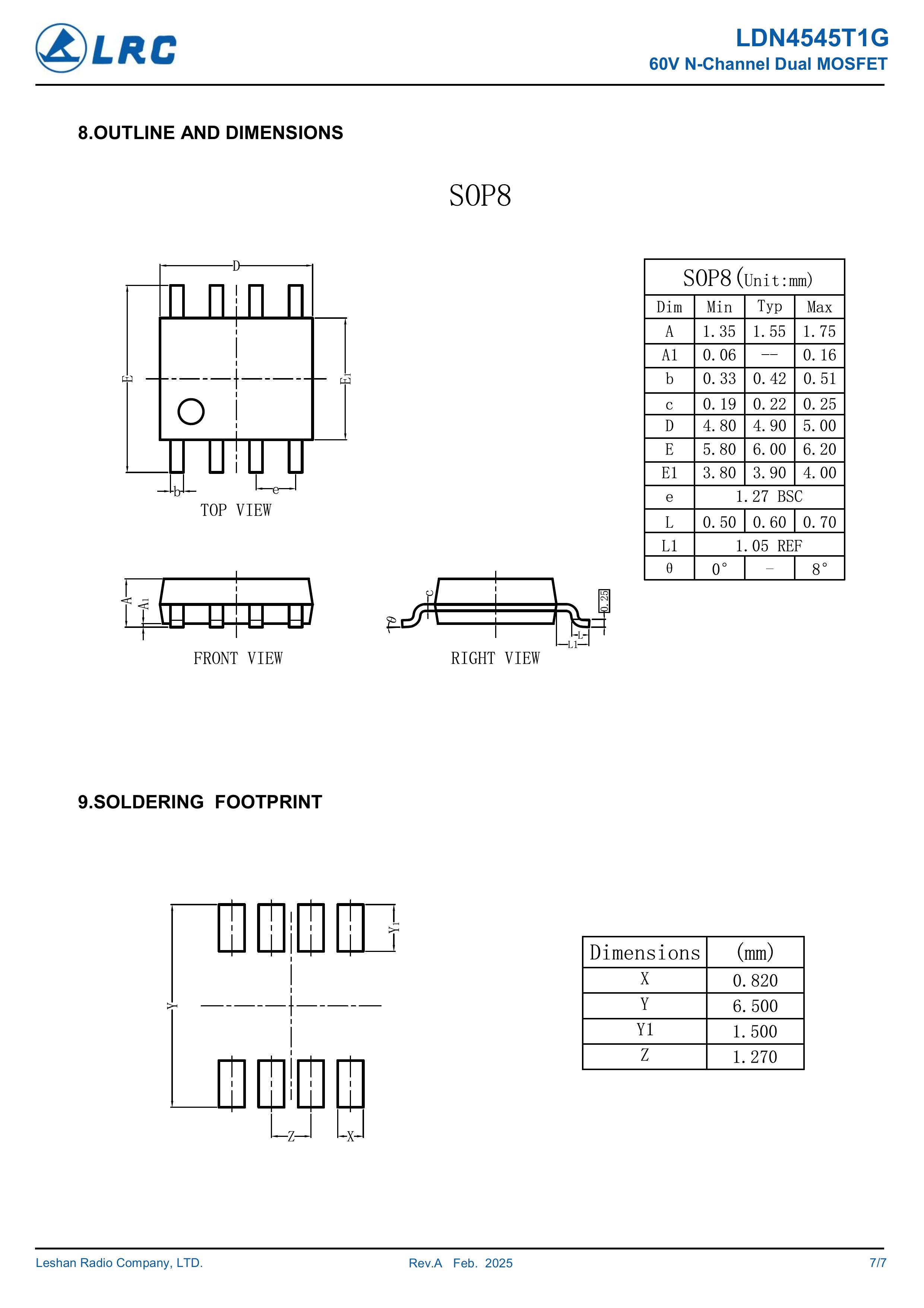 LDN4545T1G/4545 双芯片中低电压大电流低内阻低漏电的分立式功率整流晶体开关管。本品采用内置两颗大尺寸芯片,栅极2、4脚位,源极1、3脚位,漏极5~8脚位,支持多路输入输出贴片式封装,,具有适应中低电压低内阻损耗高频高效恢复快等电气特性特点。通用于电源、小家电、锂电池、马达电机、电动工具、无人机、电器、适配器、充电器、逆变器、充电桩、特种电源、高频电源、风光储新能源、医疗设备、工业工控等产品电路作电子开关、控制、整流、放大、钳位、防反接、防逆回流等作用。
