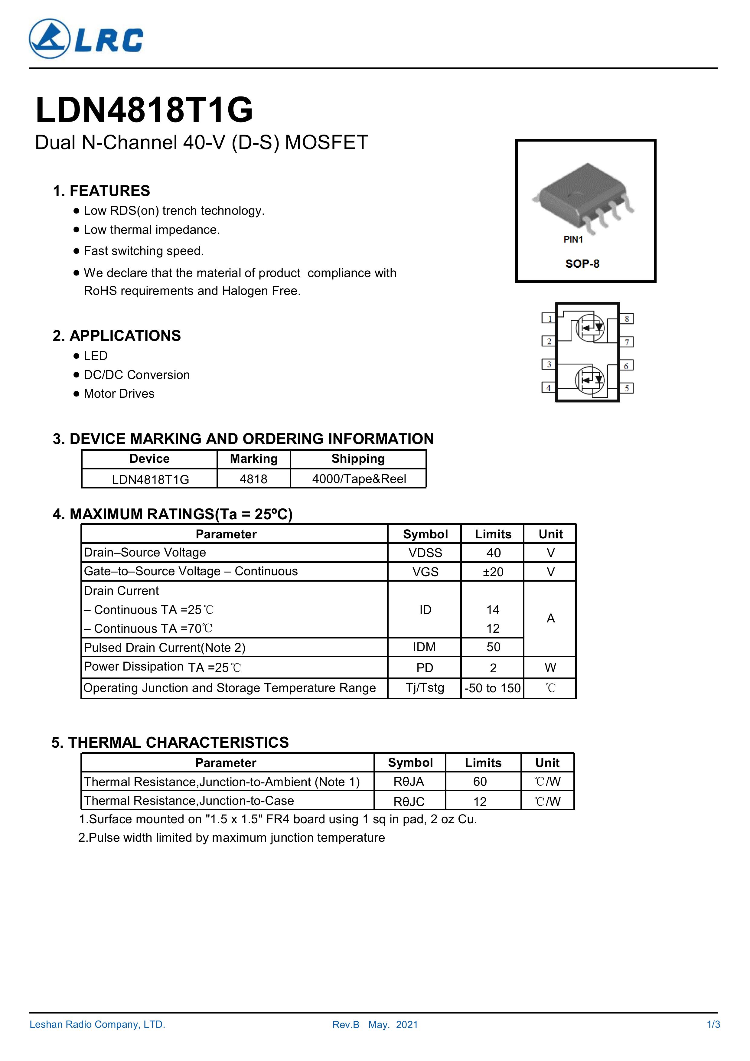 LDN4818T1G/4818 双芯片中低电压大电流低内阻低漏电的分立式功率整流晶体开关管。本品采用内置两颗大尺寸芯片,栅极2、4脚位,源极1、3脚位,漏极5~8脚位,支持多路输入输出贴片式封装,,具有适应中低电压低内阻损耗高频高效恢复快等电气特性特点。通用于电源、小家电、锂电池、马达电机、电动工具、无人机、电器、适配器、充电器、逆变器、充电桩、特种电源、高频电源、风光储新能源、医疗设备、工业工控等产品电路作电子开关、控制、整流、放大、钳位、防反接、防逆回流等作用。