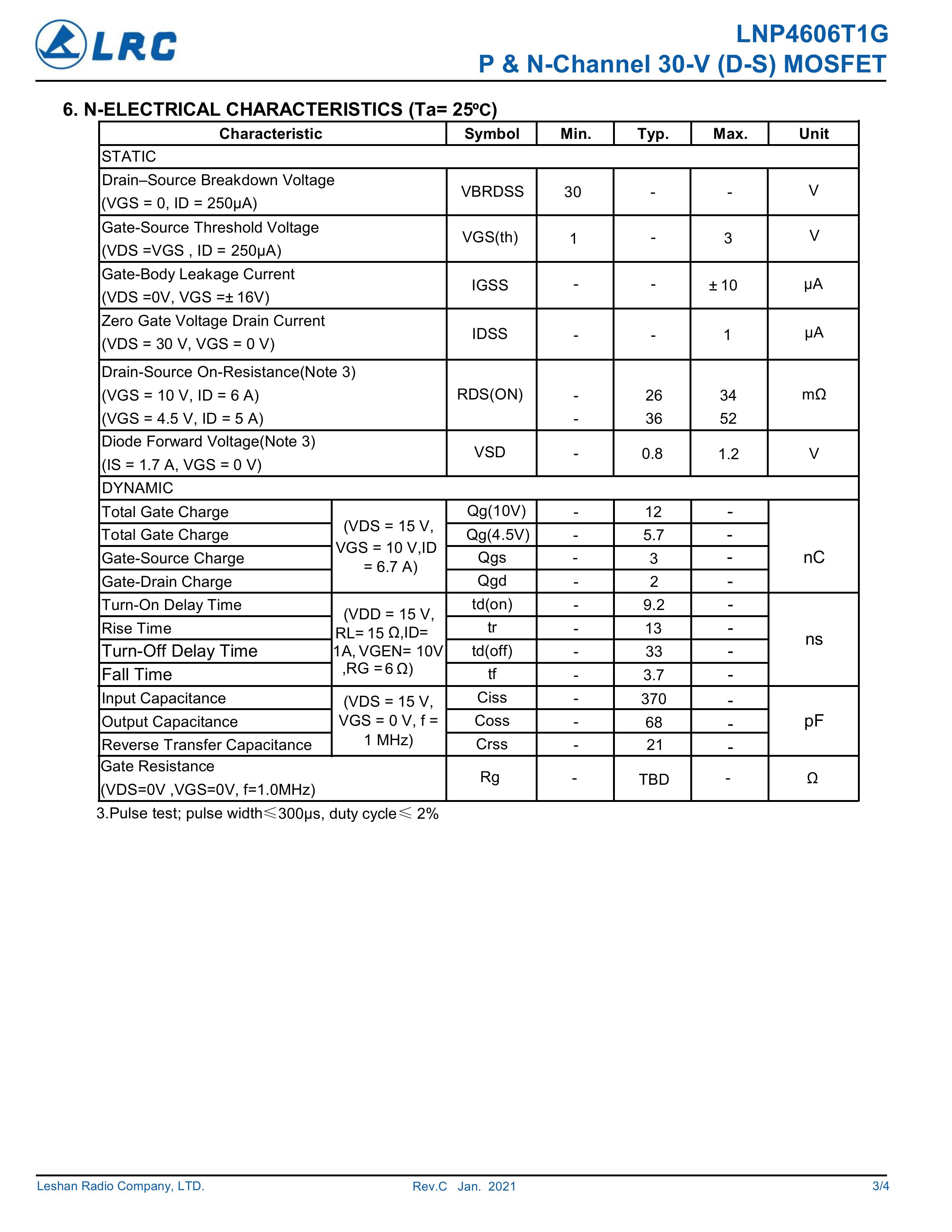 LRC/乐山无线电 LNP4606T1G/4606 全新原厂原装中低压高频分立功率器件电子开关场效应管,N&P型沟道对管场效应管正负电压30V、7A&-6A、55&75mΩ、N-Channel、贴片式中低压MOSFET: LNP4606T1G/4606。Vds电压:30V;Id电流:7A与-6A;Rds(on)内阻:55mΩ与75mΩ;封装方式:SOP-8;最小包装数量:4000pcs/盘-编带。