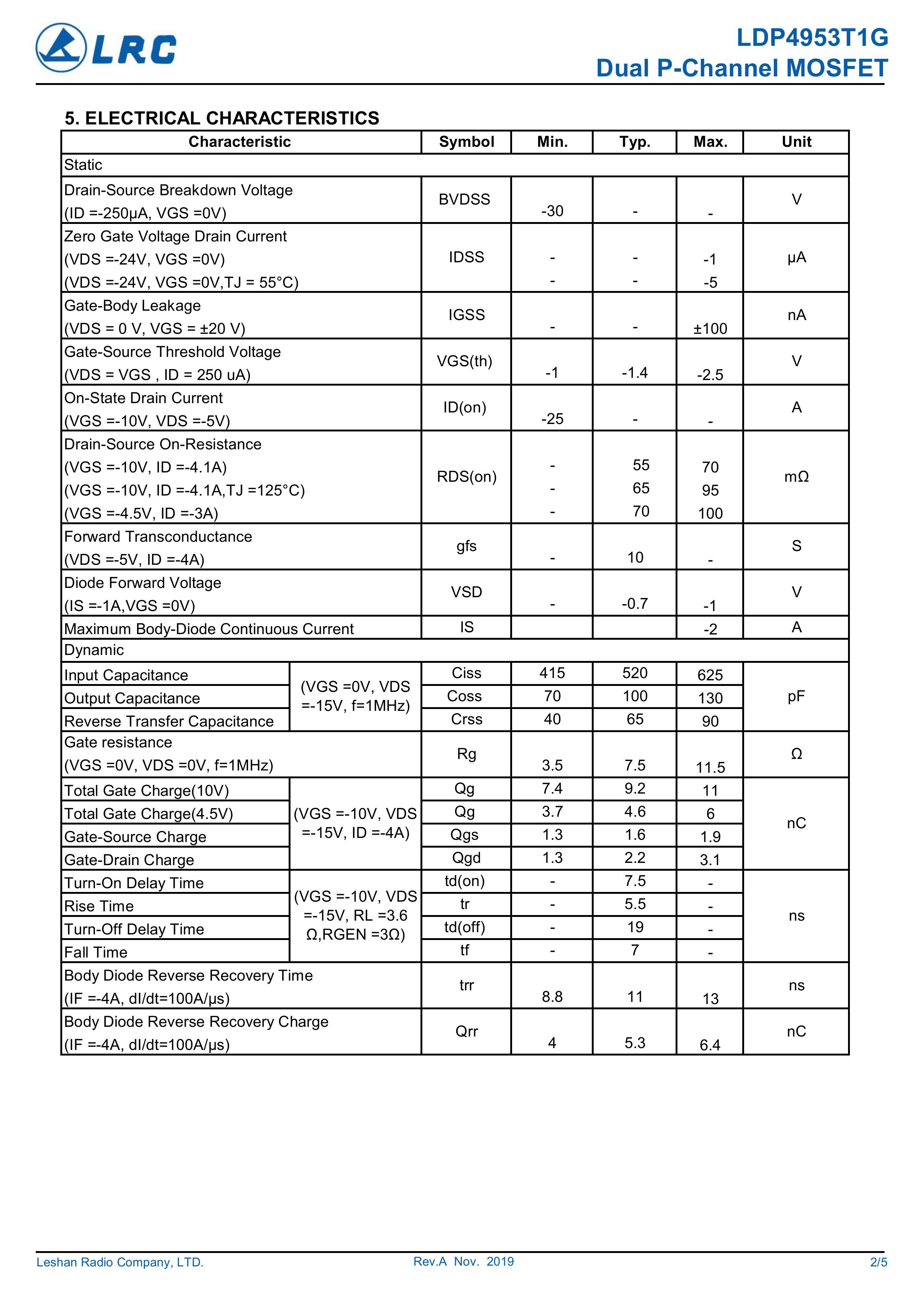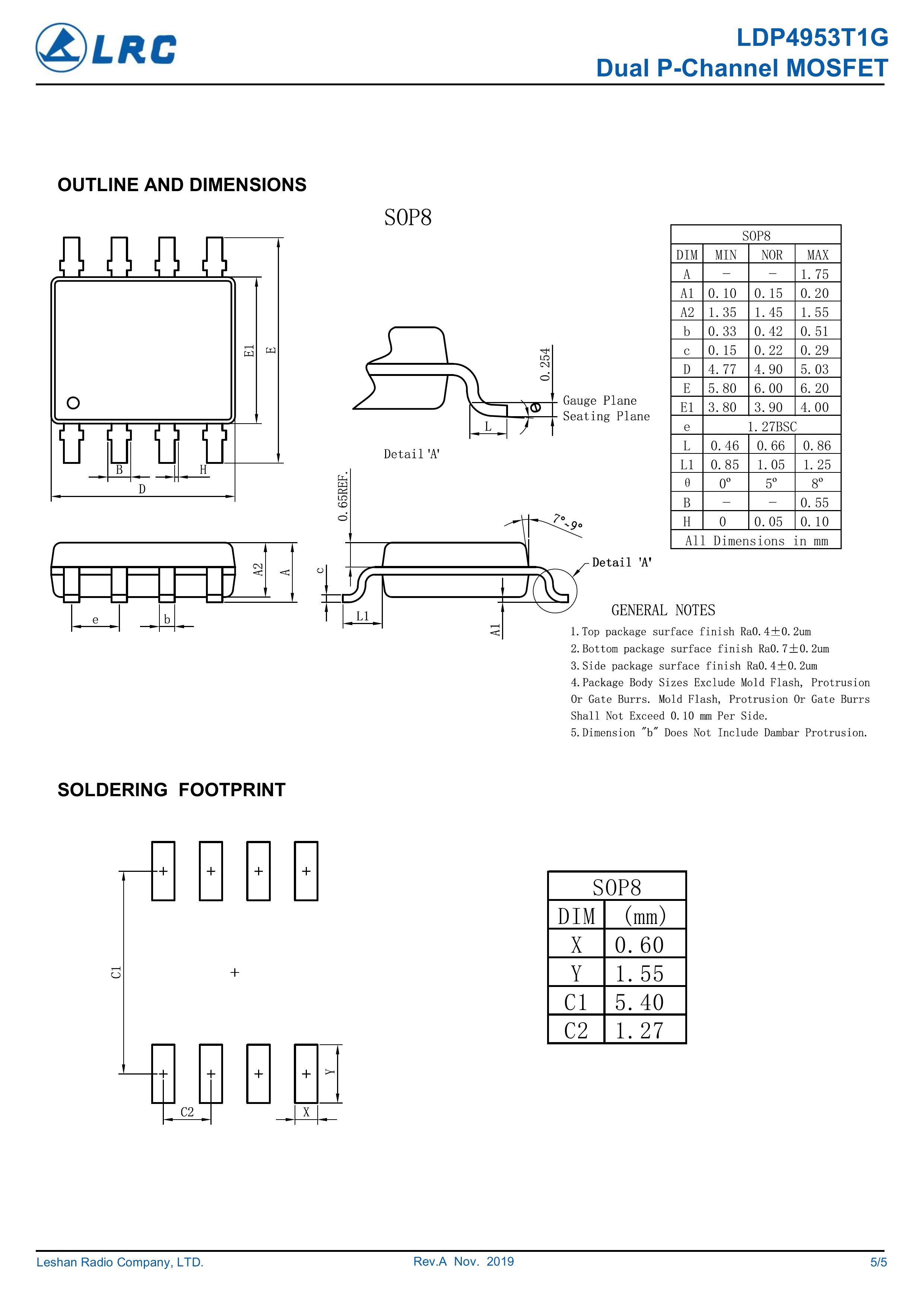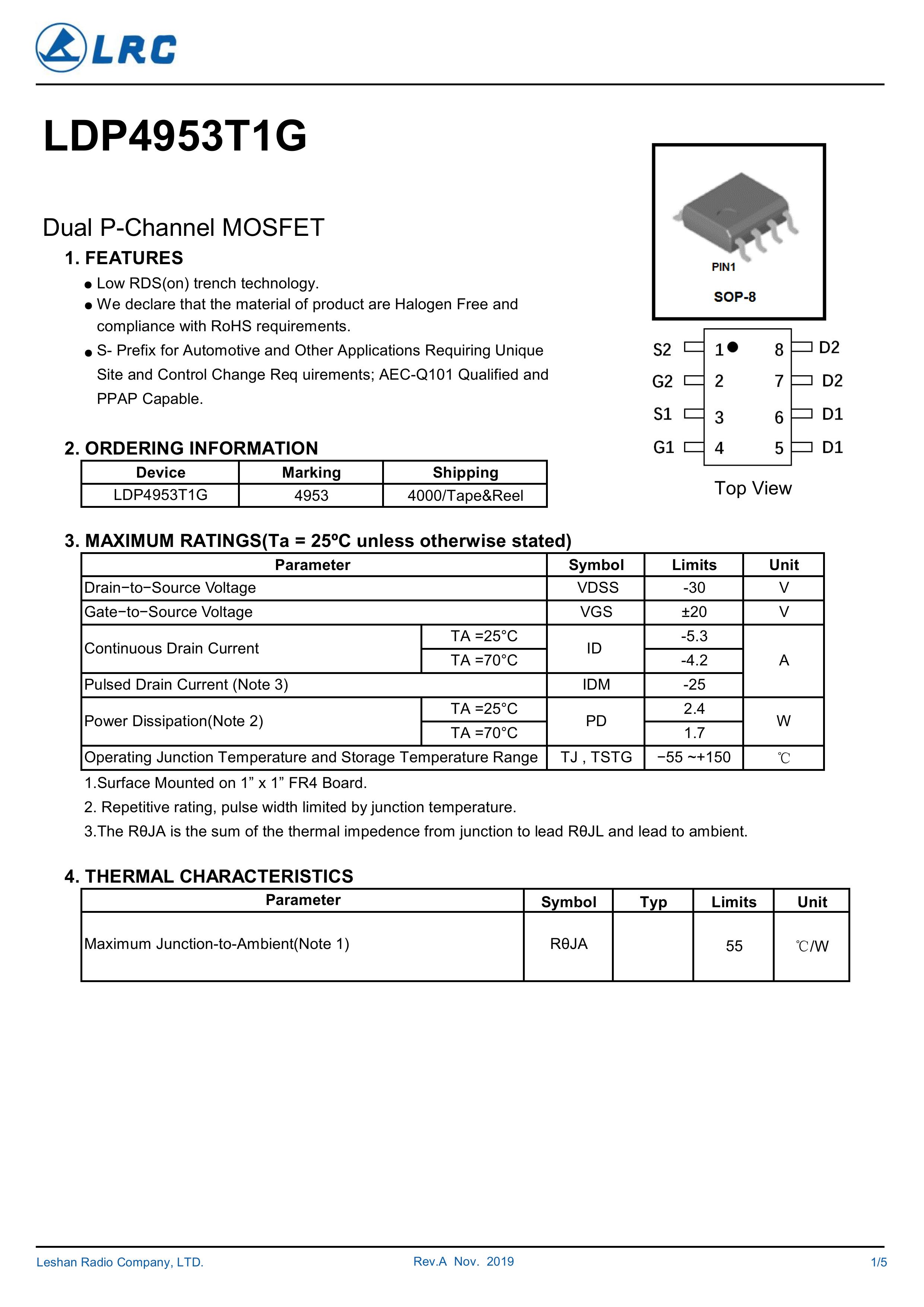 LDP4953T1G/4953 大芯片中低电压大电流低内阻低漏电的分立式功率整流晶体开关管。本品采用内置Dual P型大尺寸芯片,,,具有适应中低电压低内阻损耗高频高效恢复快等电气特性特点。通用于电源、小家电、锂电池、马达电机、电动工具、无人机、电器、适配器、充电器、逆变器、充电桩、特种电源、高频电源、风光储新能源、医疗设备、工业工控等产品电路作电子开关、控制、整流、放大、钳位、防反接、防逆回流等作用。