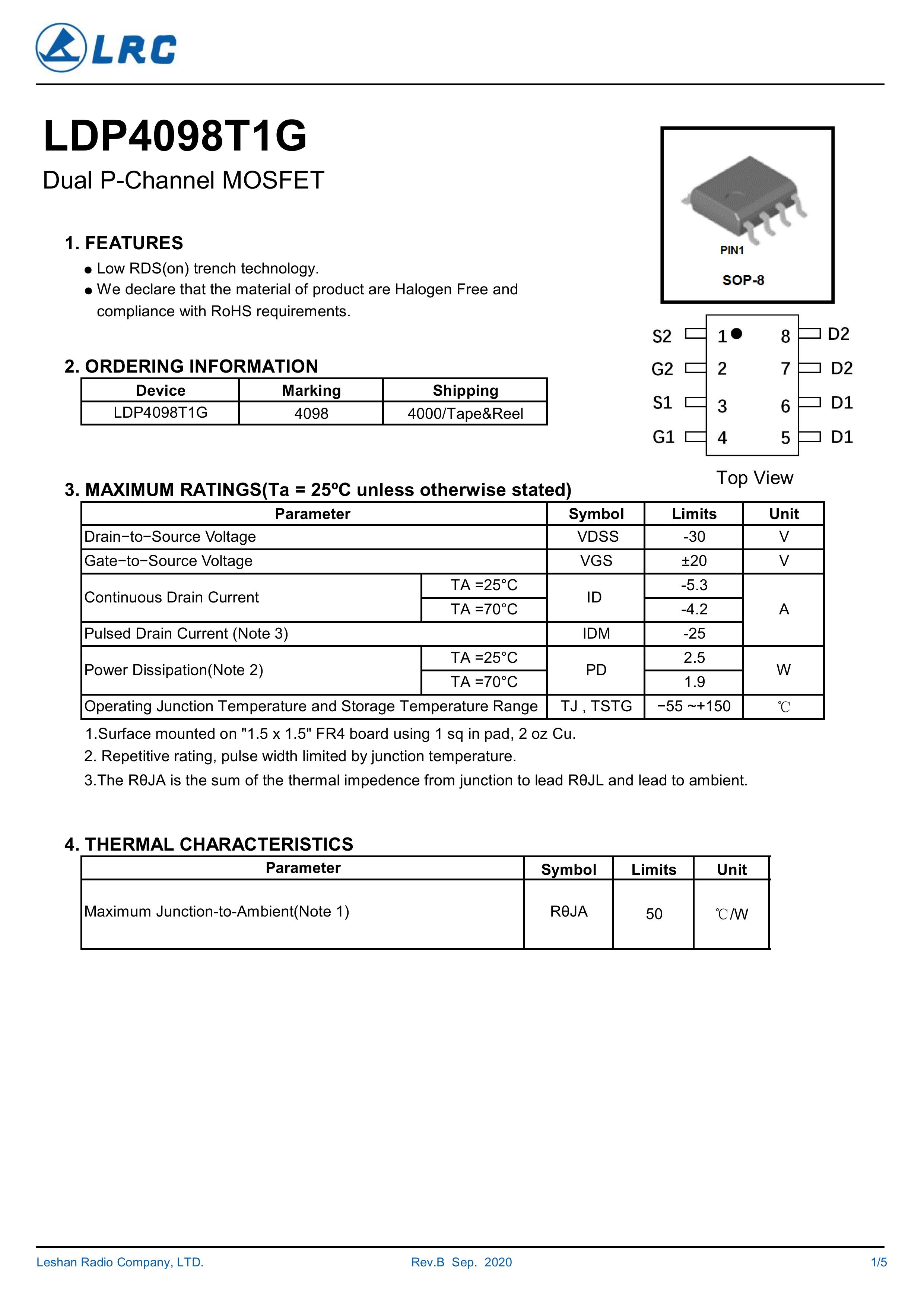 LRC/乐山无线电 LDP4098T1G/4098 全新原厂原装中低压高频分立功率器件电子开关场效应管,P型沟道双管场效应管负电压-30V、-5.3A、50mΩ、P-Channel、贴片式中低压MOSFET: LDP4098T1G/4098。Vds电压:-30V;Id电流:-5.3A;Rds(on)内阻:50mΩ;封装方式:SOP-8;最小包装数量:4000pcs/盘-编带。