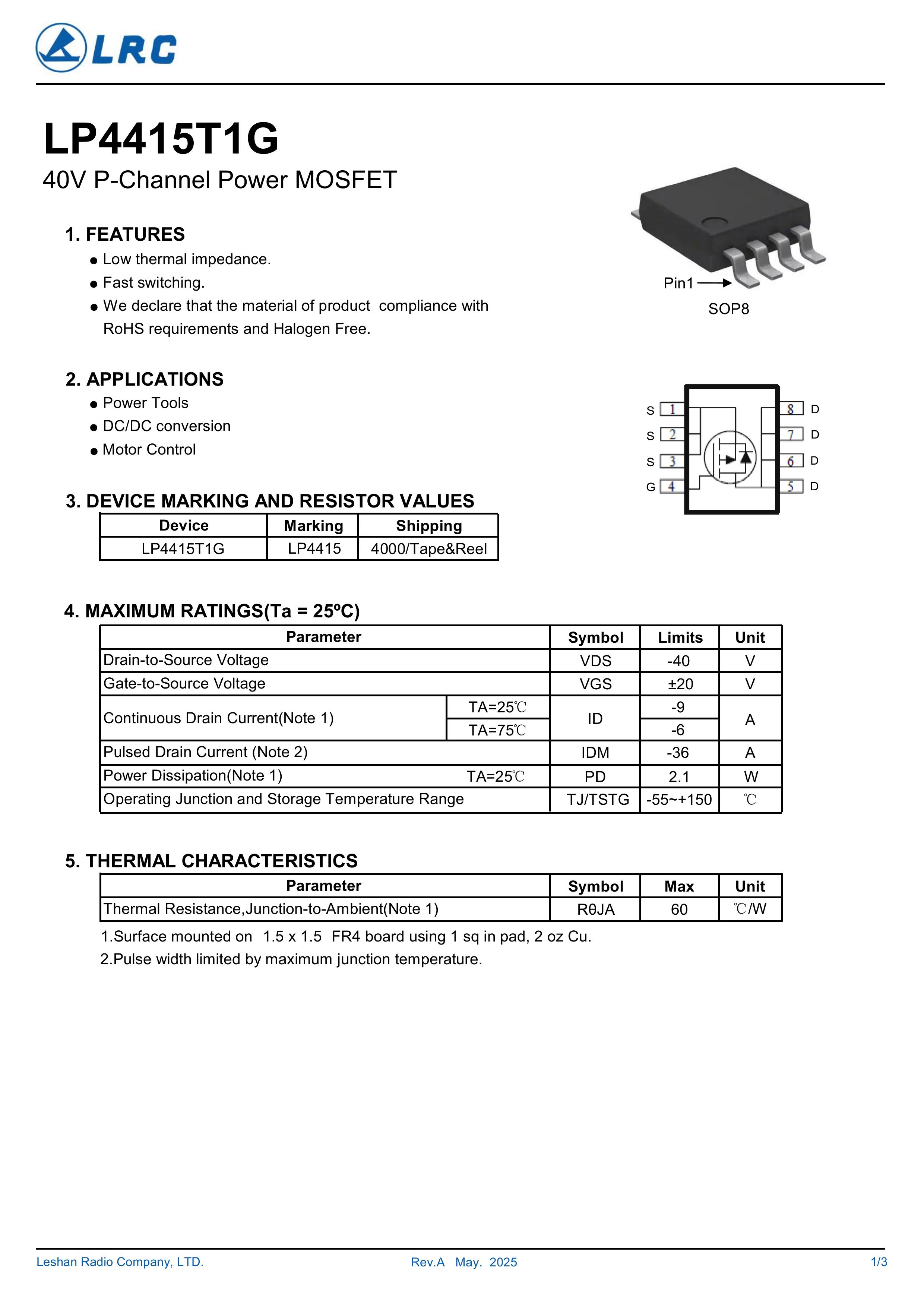 LP4415T1G/LP4415 大芯片中低电压大电流低内阻低漏电的分立式功率整流晶体开关管。本品采用内置P型沟道大尺寸芯片,源极漏极多路输入输出脚位,,具有适应中低电压低内阻损耗高频高效恢复快等电气特性特点。通用于电源、小家电、锂电池、马达电机、电动工具、无人机、电器、适配器、充电器、逆变器、充电桩、特种电源、高频电源、风光储新能源、医疗设备、工业工控等产品电路作电子开关、控制、整流、放大、钳位、防反接、防逆回流等作用。