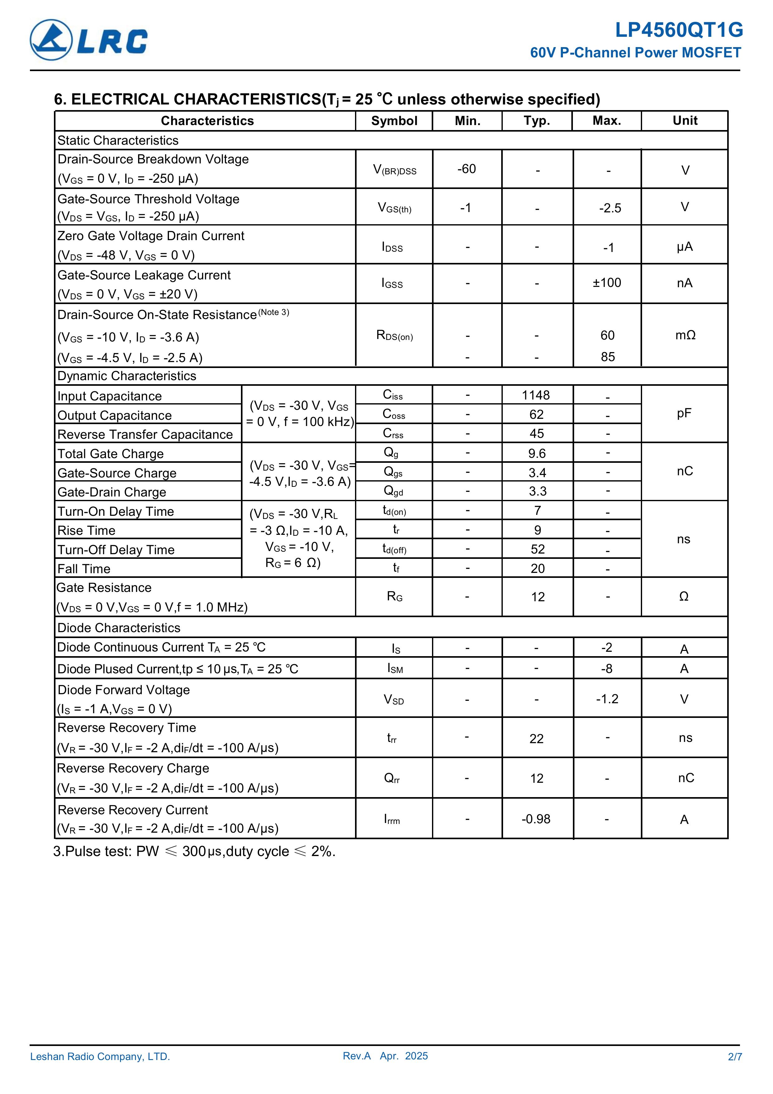 LRC/乐山无线电 LP4560QT1G/LP4560Q 全新原厂原装中低压高频分立式功率器件电子开关场效应管,P型沟道场效应管负电压-60V、-4A、60mΩ、P-Channel、贴片式中低压MOSFET: LP4560QT1G/LP4560Q。Vds电压:-60V;Id电流:-4A;Rds(on)内阻:60mΩ;封装方式:SOP-8;最小包装数量:4000pcs/盘-编带。