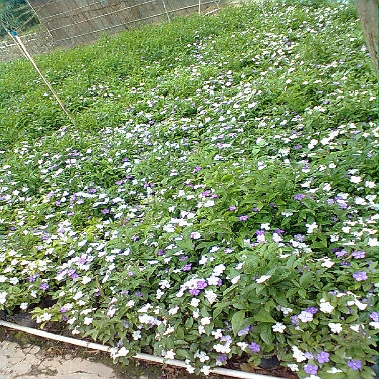 鸳鸯茉莉:茄科鸳鸯茉莉属常绿矮灌木,是华北夏季露天摆放和冬季室内布置的优良盆栽花卉。鸳鸯茉莉高50至100厘米,单叶互生,花大多单生,少有数朵聚生的。花冠呈高脚碟状,有浅裂,花期4月至10月,单花开放5天左右。花朵初开为蓝紫色,渐变为雪青色,后变为白色,由于花开有先后,在同株上能同时见到蓝紫色和白色的花,故又叫双色茉莉。