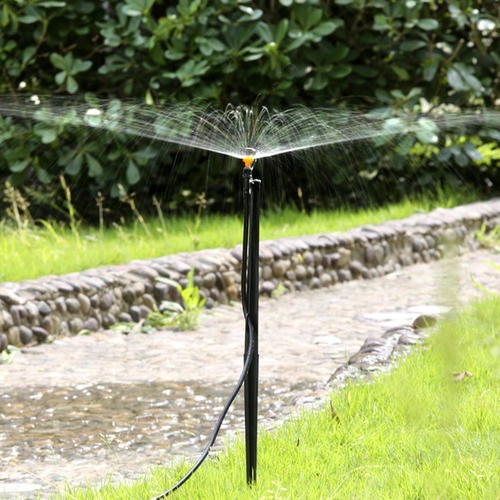 地插微喷组合是由微喷头、插杆、毛管、毛管双接头和山字形转换接头组成。 先按照上述顺序把这些小部件连接好,微喷头和山字形转换接头连接的时候采用承插时连接,安装微喷头的时候应小心,避免损坏微喷头,连接山字形转换接头的时候,要提前擦拭干净,以免堵塞微喷头,毛管应插到头,防止漏水。 使用地插式微喷头时,一般选用雾化效果较好的地插式折射雾化微喷头或地插式双侧轮微喷头,从而提供较好的雾化效果或较大的喷洒半径,满足不同的需求。和农业灌溉一样,应用微喷头建造喷泉景观时,应当注意防止堵塞,因为即使喷泉景观使用的是水质较好的自来水等水源,但是其中仍有许多的杂质或水垢会将微喷头的喷嘴堵塞,因此,在建设微喷头喷泉时,应该注意必须安装网式过滤器或叠片式过滤器,充分过滤其中的杂质,防止微喷头堵塞。