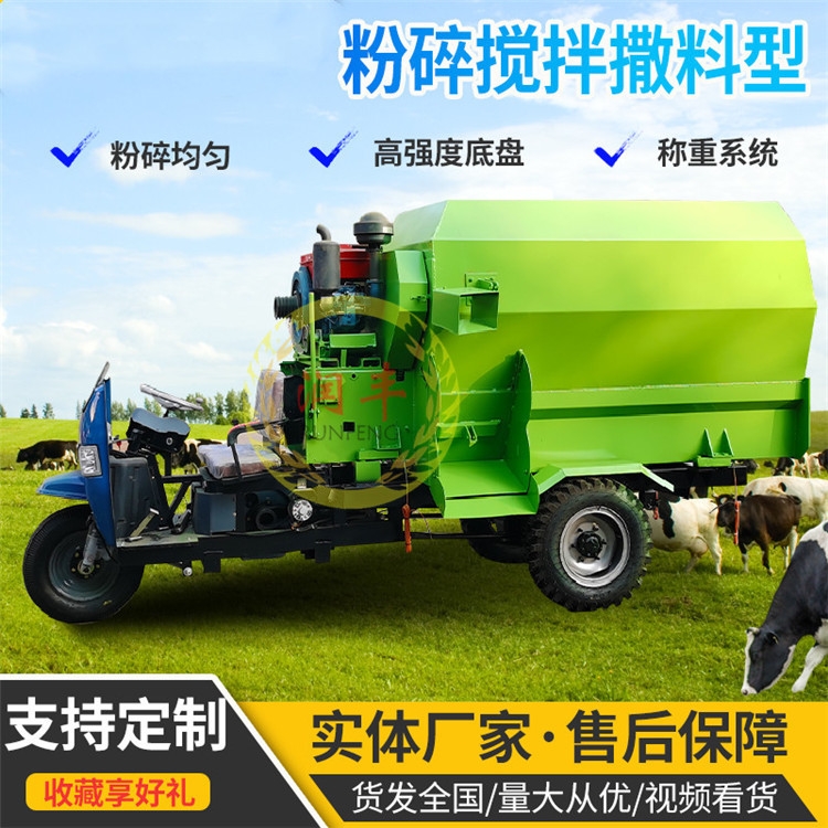 撒料车的主要功能是将成品日粮直接抛撒在饲喂区域内一次性完成饲喂,广泛用于农牧业养殖区,大中型饲养场和规范社区饲养场的饲喂作业,可将各种牧草,农作物秸秆,青贮饲料等纤维性饲料混合搅拌均匀后,投入本车内,进行投喂作业。使用简单方便,易于操作,产品质量可靠,经久耐用,撒料过程中可根据用户的圈宿牲畜的密度调节饲喂料,使用效率高,省时省力,节省养殖场空间。