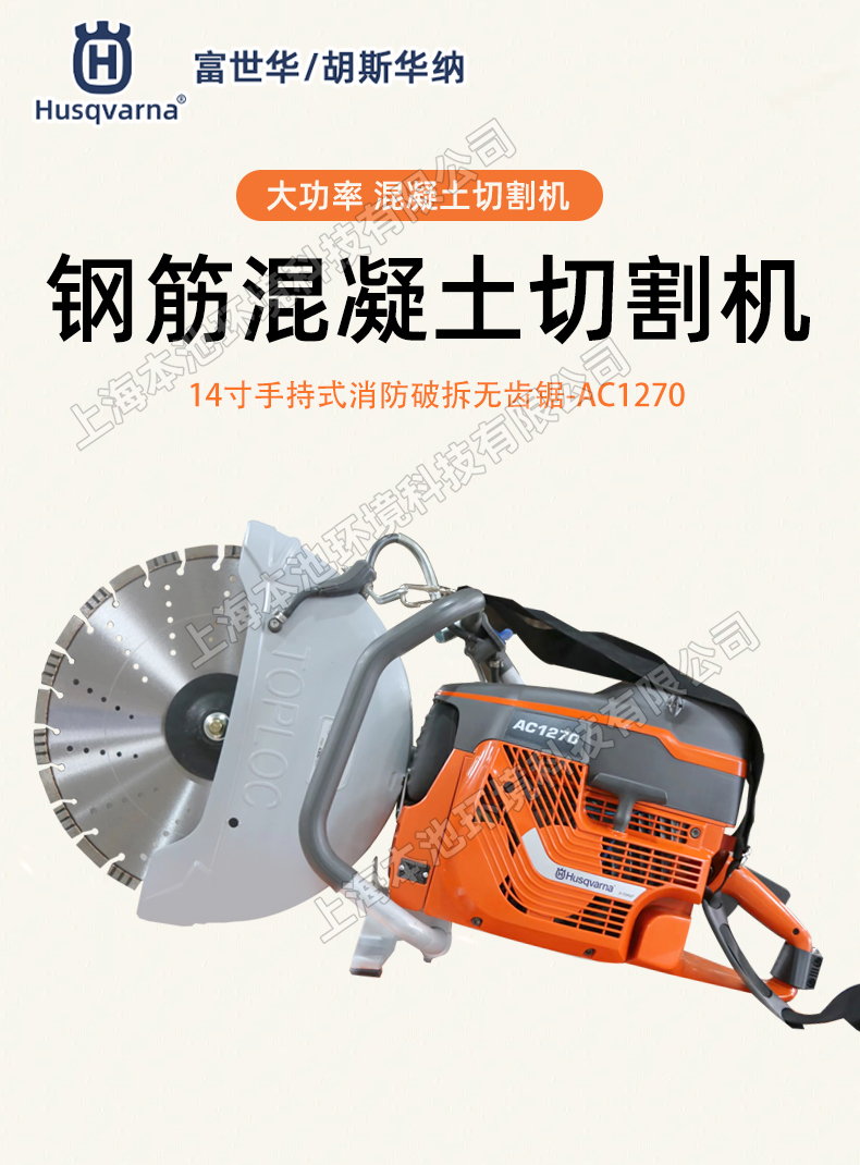 Husqvarna富世华/胡斯华纳AC1270切割锯,手持式消破拆无齿锯,5.8KW大功率,锯片直径400mm,钢板切割锯。适用于消防破拆,铁轨钢轨切割,混凝土切割,石材墙壁切割等多种场合。
