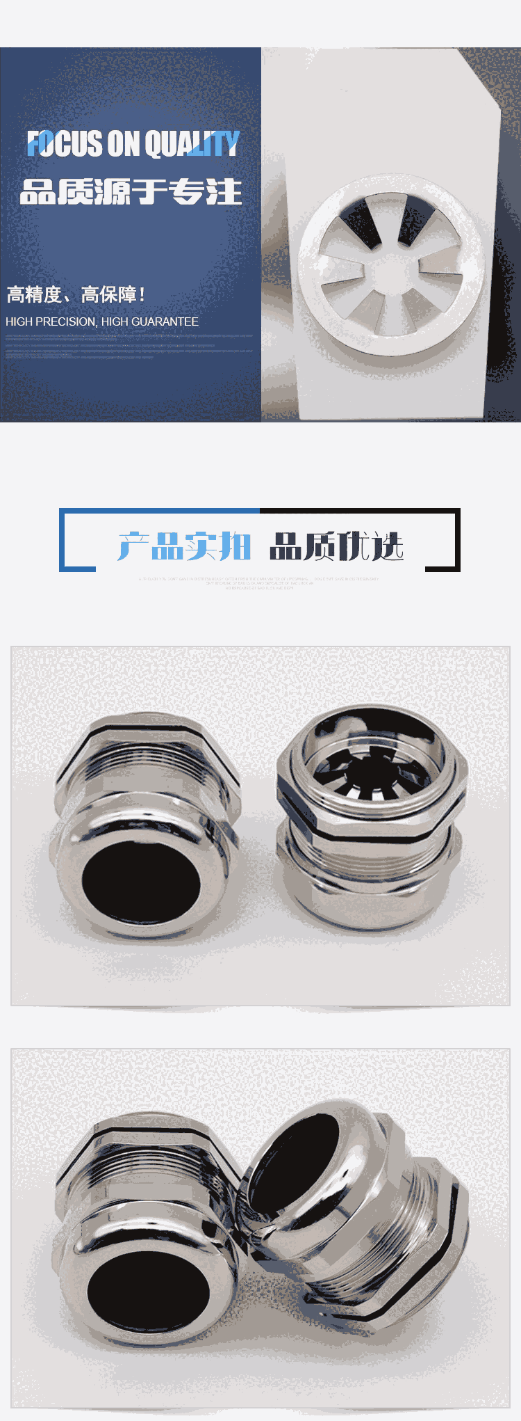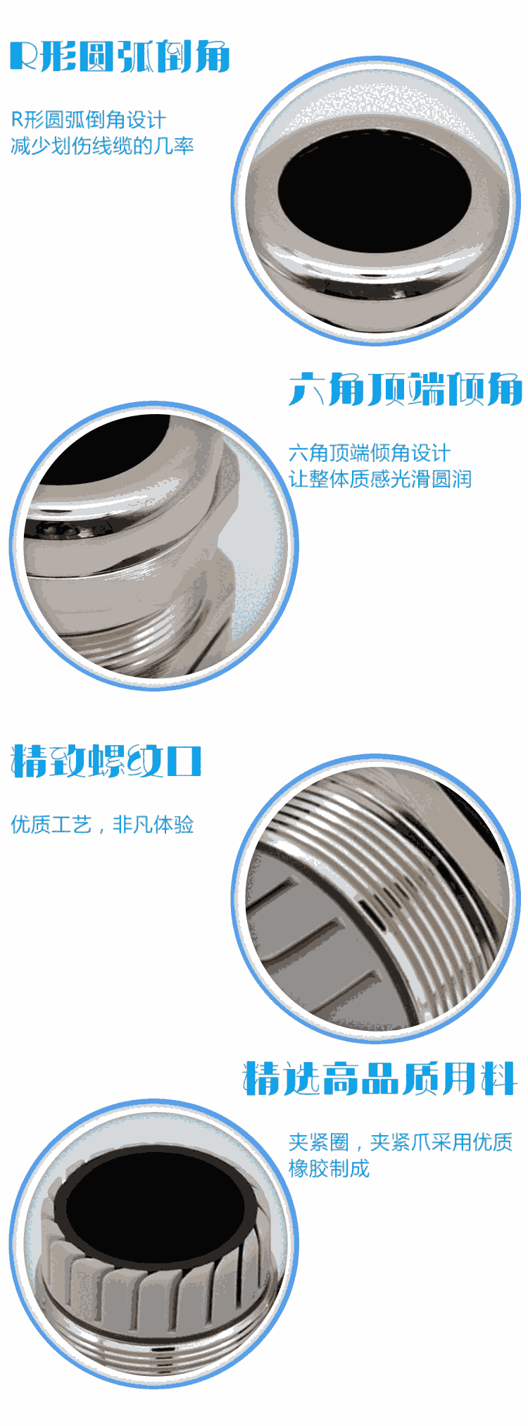 安装方法:出线口一端可将进出电缆锁紧并起到防水防尘、防震动的作用,另一端可接入设备箱体上,也可以根据选用螺纹接入进出口为内螺纹的电动设备上。