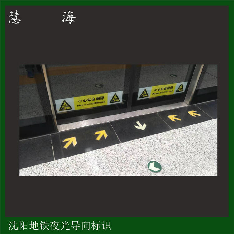 不锈钢蓄光消防安全导向标识是目前轨道交通必须安装的逃生疏散指示地标,在屏蔽门、站厅地面以及楼梯出口均要安装指向安全出口。杭州慧海公司研制的以304不锈钢为基材、加入长余辉夜光粉制作的此类地标,吸收可见光3-5分钟,可在暗处持续发光12小时以上,且发光效果无半衰期,可持续循环使用20年以上,只要不人为损坏就无需更换,一劳永逸。在地下轨道发生停电或火灾等紧急情况下,可以指引人群疏散逃生。该标识已取得蓄光安全标识,消防产品检测报告。