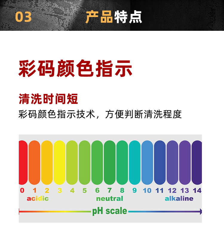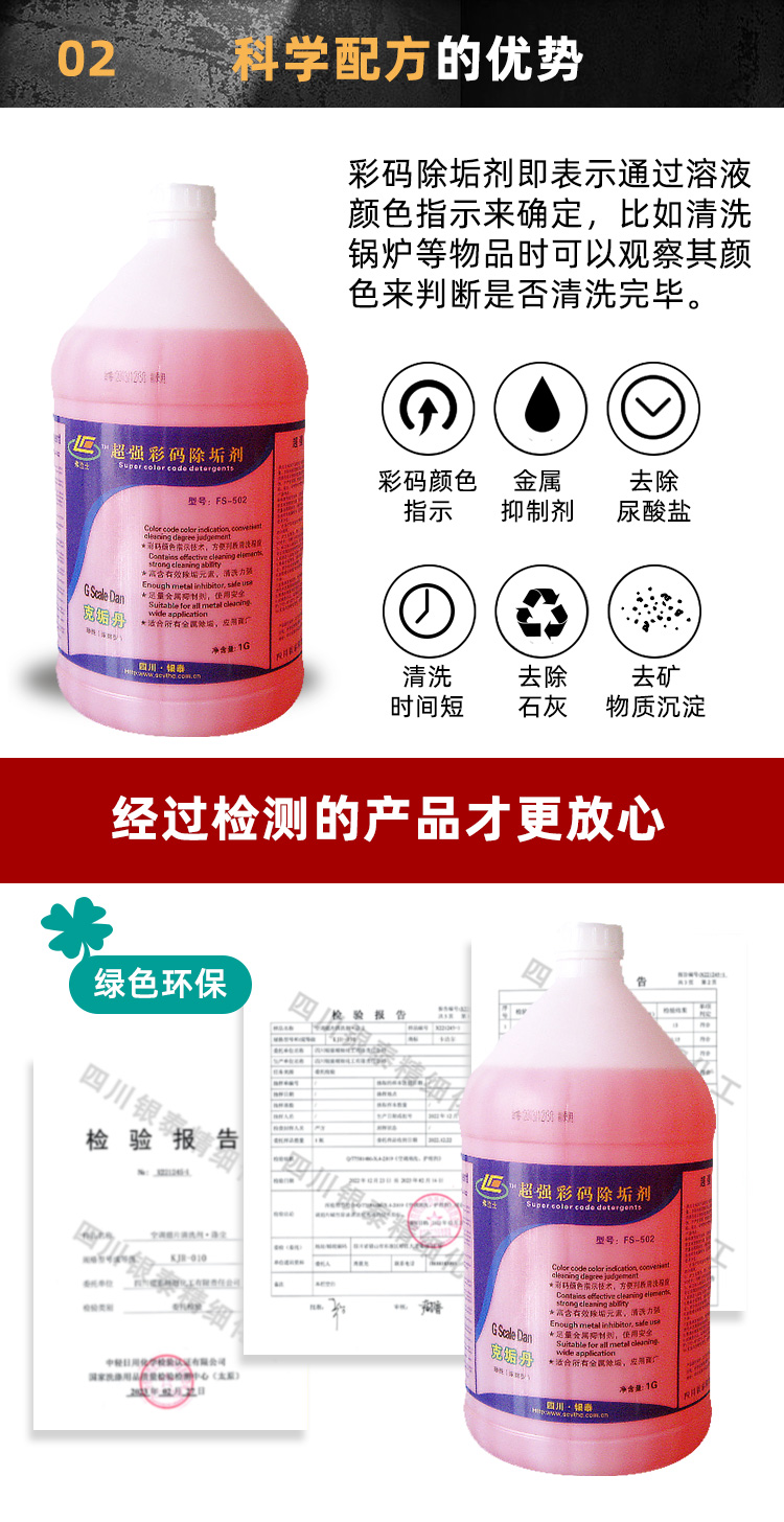 1.彩码颜色指示技术,方便判断清洗程度;2.富含有效除垢元素,强力清除石灰,钙镁盐沉淀.二氧化硅.锈氧化物等;3.足量金属抑制剂,使用安全,适合所有金属除垢,应用面广。