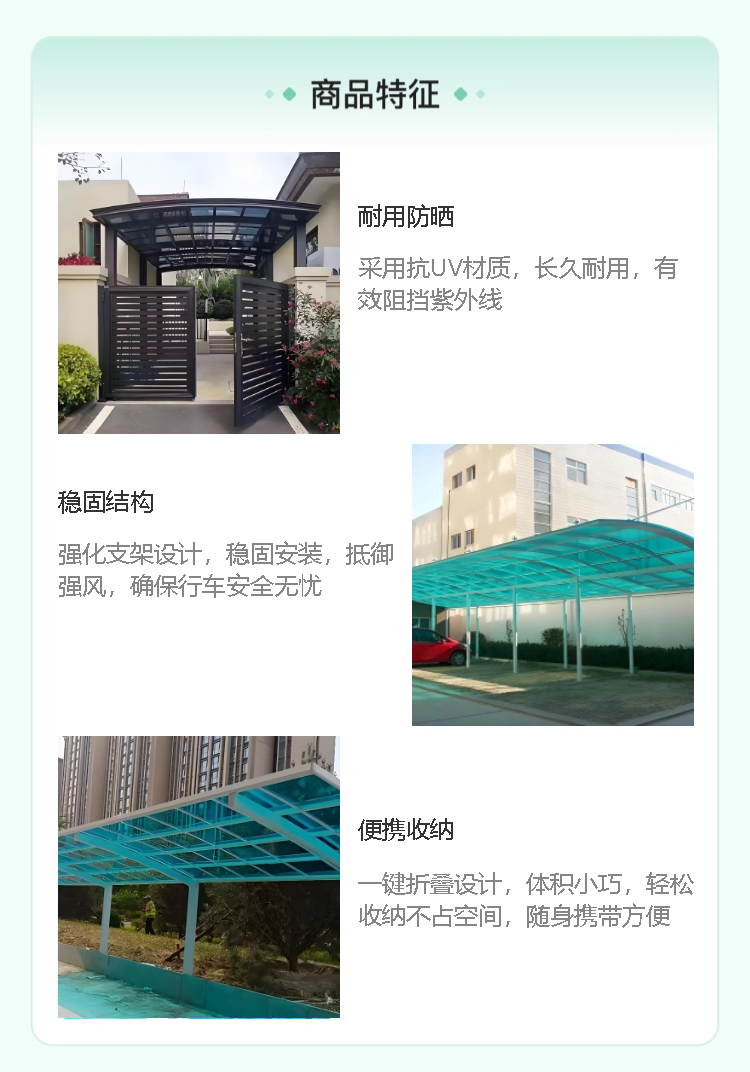 停车篷功能特点 | 遮阳防晒 防雨防水防风稳固 | ||