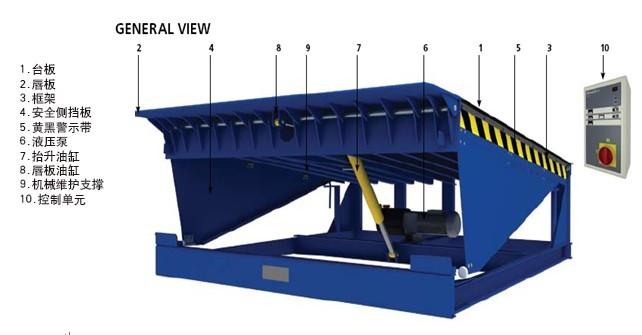 装卸平台正常关闭状态是平铺在地面,与地面保持水平,当货车到达预定位置,按动开启按钮使平台抬高,待前面唇板伸出,平台缓慢下降,唇板搭到货车车厢内部,此时平台液压泵不受力。叉车即可安全通行。
