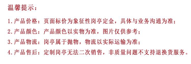岗亭整体结构:1、岗亭材质表面经特殊工艺加工处理,精工制作而成,款型别致,品种繁多,美观大方、稳固耐用,适用于各种通道关卡及停车场。2、主题骨架采用优质不锈钢整体焊接而成,强度高,抗风压。3、顶部材料采用特殊防水铰接工艺,彻底解决漏水之患。4、所有岗亭留有空调及其它电器电源插座,方便使用。可根据您的特殊要求设计制造出不同款式。 联系电话:15822882616,公司网址:www.tjsjst.cn