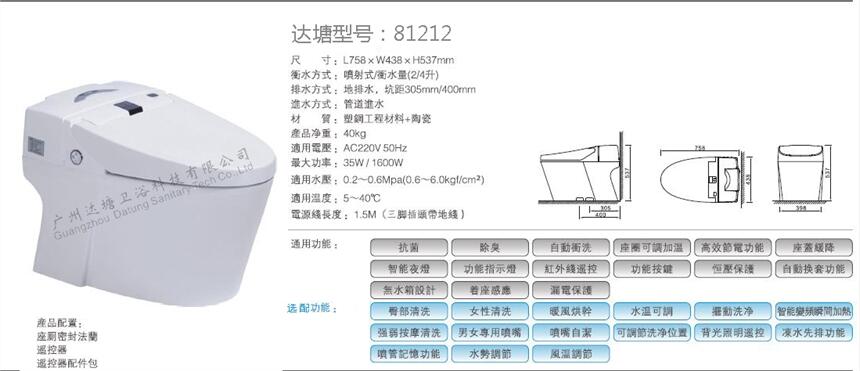 冲水方式:喷射虹吸式冲水按键触屏控制