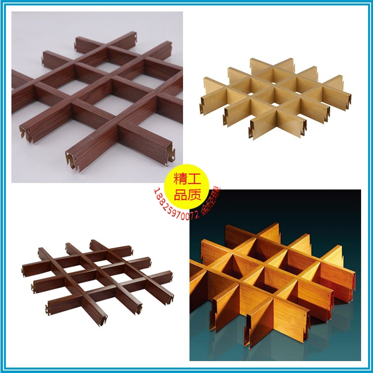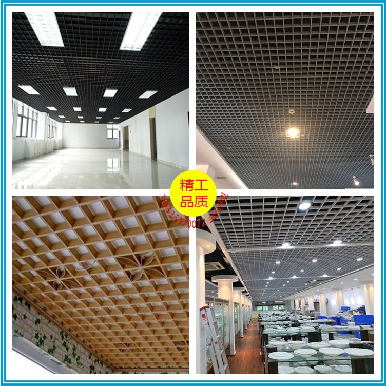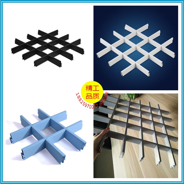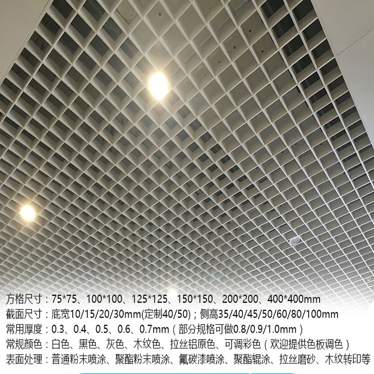 粤艺佰铝格栅天花根据款式不同一般分为方格格栅天花及三角形(菱形)格栅天花,方格格栅天花是目前市面上采用最多的一种款式。格栅天花吊顶系统分为格栅主骨和副骨,格栅主骨及副骨均为特制金属空腹板条。标准为10mm或15mm,高度有35mm、50mm和80mm可供选择。铝格栅格子尺寸分别有100X100、150X150、200X200可供选择。铝方格格栅天花颜色通常为黑白灰及木纹色,也可根据要求定制其他色彩。同时方格格栅的主副骨根据不同要求可定制不同的尺寸,常规的主副骨格栅条侧面高度为35-80mm,格栅条的材料厚度为0.3-0.6mm、根据不同吊顶场所及设计要求,合理选配合适的材料料厚度及方格大小,兼顾吊顶效果及经济性。铝格栅吊顶粤艺佰黑色铝格栅 150x150铝格栅