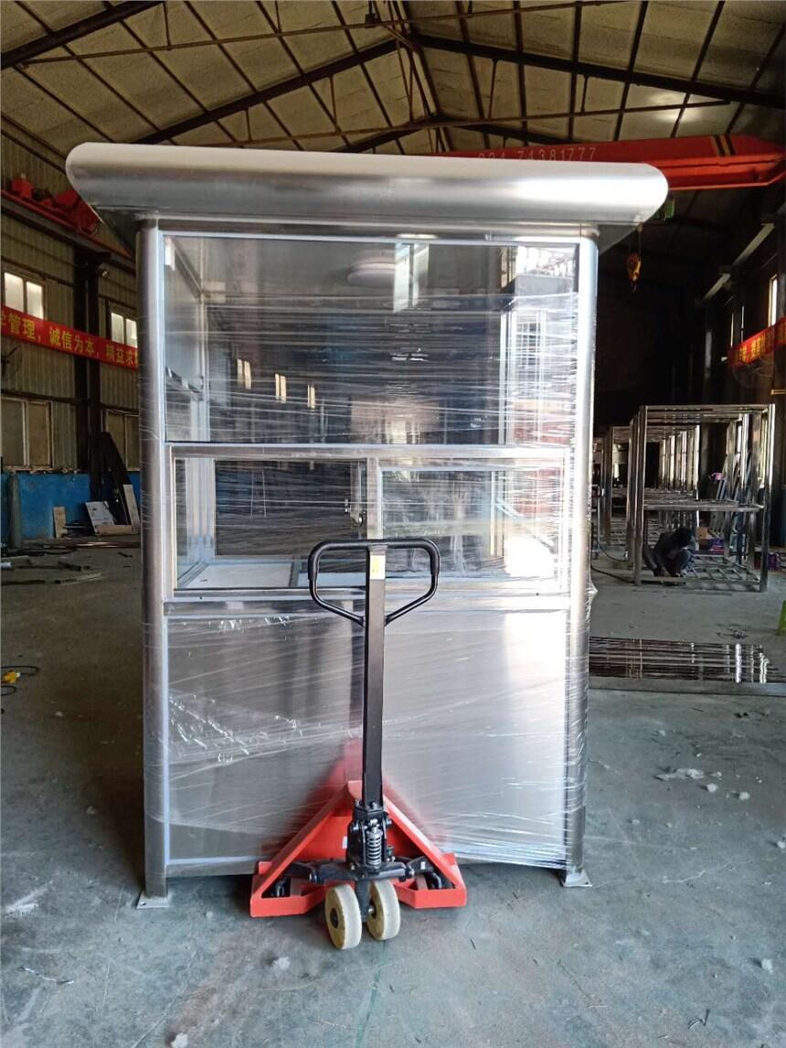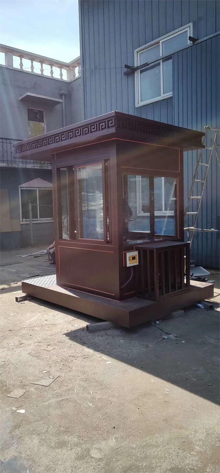 ① 框架结构:80*80镀锌钢管材厚度2.5mm ② 框架:80*80镀锌钢管厚度2.5mm,防盗门,塑钢窗5 5 5中空玻璃,门为防盗门 ③ 墙体:内墙豪华木工板,外墙豪华金属雕花板,内保温层岩棉填充 ④ 顶部:1.5镀锌板剪折做造型,50*50*2.0做主料,30*30*1.5做辅料,,上铺沥青瓦,豪华pvc吊顶 ⑤ 灯具:LED灯具,电源箱,开关,五孔插座,4平方暗线 ⑥ 底座:80*80*2.5镀锌管做底座,2.0mm花纹铁板打底,面铺豪华复合地板