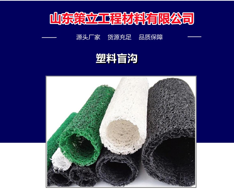 塑料盲沟材国际上称为复合土工排水体 (GDS),又称三维排水板,土木工程用集排水暗渠材等。是将热塑性合成树脂加热溶化后通过喷咀挤压出纤维丝叠置在一起,并将其相接点熔结而成的三维立体多孔材料。产品有圆形及矩形断面等多种,产品规格有好几种。可根据客户订货以不同配方生产耐高温、阻燃、耐强酸碱、高弹性、高硬度等不同特性产品。