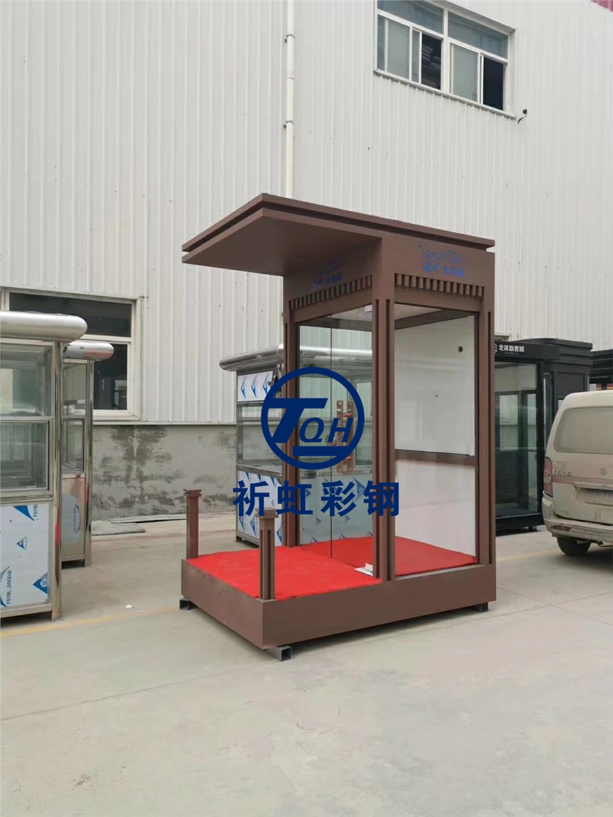 6、彩钢岗亭:是由内墙为复合板和外墙彩钢板组成。彩钢板涂层是冷轧钢板、镀锌钢板,进行表面化学处理后涂敷(辊涂)或复合有机薄膜(PVC膜等),再经烘烤固化而制成的产品。既具有钢铁材料机械强度高,易成型的性能,又兼有涂层材料良好的装饰性和耐腐蚀性。