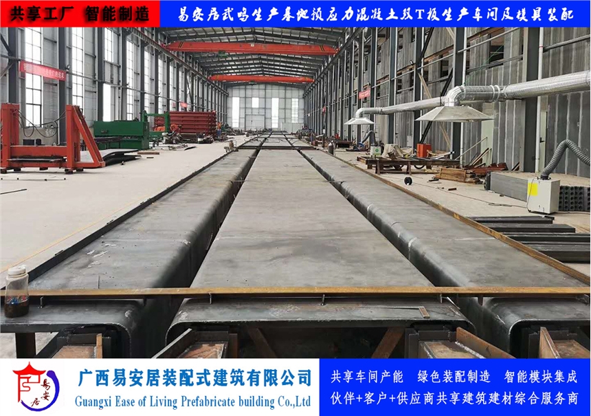 广西易安居装配式建筑有限公司有大型预应力混凝土双T板生产设备及生产线和技术检验设备,采用梁板合一式结构,用预应力碳素钢丝和预应力钢绞线做梁的主筋。通过良好的检测手段,确保了产品质量。生产规格尺寸有:以3m为模楼,跨度9-30m,宽度为2m、2.4m、3m的大型预应力混凝土双T板。产品应用于大跨度厂房、仓库等建筑屋面和楼层。具有以下特点:1)跨度大:9-30米跨度,节省梁、板、柱,减少模板、架杆等费用,降低工程造价;缩短工期,加快施工速度。2)结构性能稳定:稳定,防火等级高、抗震性高、保温性能好,抗剪力强,可开天窗;结构找坡,自然防水。3)吊装方便,板面四角有吊环。厂房等建筑搬迁时可重复利用、寿命长达50年。4)工期短,车间、仓库只要把房框砌好,就等于工程完工卖家提供运送及吊装上房服务;屋面坚固,不受大风、暴雪等自然灾害影响;